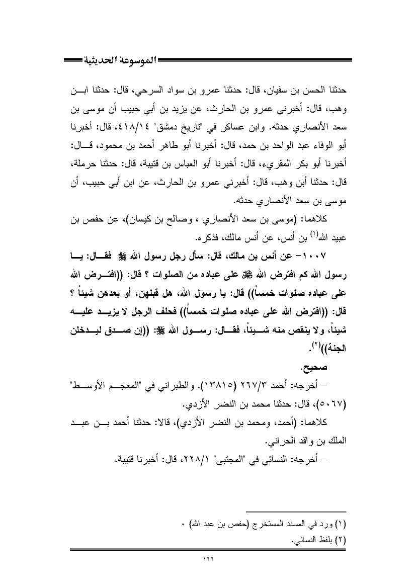 ١٠٠٧ - عن أنس بن مالك، قال: سأل رجل رسول اللَّه -صلى اللَّه عليه وسلم- فقال: يا رسول اللَّه كم افترض اللَّه عزَّ وجلَّ على عباده من الصلوات؟ قال: "افترض اللَّه على عباده صلوات خمسًا" قال: يا رسول اللَّه، هل قبلهن، أو بعدهن شيئًا؟ قال: "افترض اللَّه على عباده صلوات خمسًا" فحلف الرجل لا يزيد عليه شيئًا، ولا ينقص منه شيئًا، فقال: رسول اللَّه -صلى اللَّه عليه وسلم-: "إن صدق ليدخلن الجنة" (¬٢).