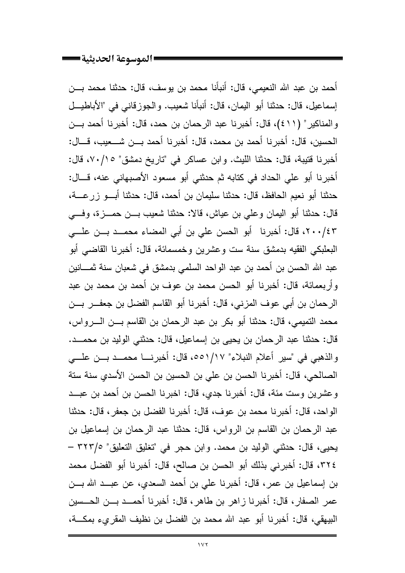 أحمد بن عبد اللَّه النعيمي، قال: أنبأنا محمد بن يوسف، قال: حدثنا محمد بن إسماعيل، قال: حدثنا أبو اليمان، قال: أنبأنا شعيب. والجوزقاني في "الأباطيل والمناكير" (٤١١)، قال: أخبرنا عبد الرحمان بن حمد، قال: أخبرنا أحمد بن الحسين، قال: أخبرنا أحمد بن محمد، قال: أخبرنا أحمد بن شعيب، قال: أخبرنا قتيبة، قال: حدثنا الليث. وابن عساكر في "تاريخ دمشق" ١٥/ ٧٠، قال: أخبرنا أبو علي الحداد في كتابه ثم حدثني أبو مسعود الأصبهاني عنه، قال: حدثنا أبو نعيم الحافظ، قال: حدثنا سليمان بن أحمد، قال: حدثنا أبو زرعة، قال: حدثنا أبو اليمان وعلي بن عياش، قالا: حدثنا شعيب بن حمزة، وفي ٤٣/ ٢٠٠، قال: أخبرنا أبو الحسن علي بن أبي المضاء محمد بن علي البعلبكي الفقيه بدمشق سنة ست وعشرين وخمسمائة، قال: أخبرنا القاضي أبو عبد اللَّه الحسن بن أحمد بن عبد الواحد السلمي بدمشق في شعبان سنة ثمانين وأربعمائة، قال: أخبرنا أبو الحسن محمد بن عوف بن أحمد بن محمد بن عبد الرحمان بن أبي عوف المزني، قال: أخبرنا أبو القاسم الفضل بن جعفر بن محمد التميمي، قال: حدثنا أبو بكر بن عبد الرحمان بن القاسم بن الرواس، قال: حدثنا عبد الرحمان بن يحيى بن إسماعيل، قال: حدثني الوليد بن محمد. والذهبي في "سير أعلام النبلاء" ١٧/ ٥٥١، قال: أخبرنا محمد بن علي الصالحي، قال: أخبرنا الحسن بن علي بن الحسين بن الحسن الأسدي سنة ستة وعشرين وست مئة، قال: أخبرنا جدي، قال: أخبرنا الحسن بن أحمد بن عبد الواحد، قال: أخبرنا محمد بن عوف، قال: أخبرنا الفضل بن جعفر، قال: حدثنا عبد الرحمان بن القاسم بن الرواس، قال: حدثنا عبد الرحمان بن إسماعيل بن يحيى، قال: حدثني الوليد بن محمد. وابن حجر في "تغليق التعليق" ٥/ ٣٢٣ - ٣٢٤، قال: أخبرني بذلك أبو الحسن بن صالح، قال: أخبرنا أبو الفضل محمد بن إسماعيل بن عمر، قال: أخبرنا علي بن أحمد السعدي، عن عبد اللَّه بن عمر الصفار، قال: أخبرنا زاهر بن طاهر، قال: أخبرنا أحمد بن الحسين البيهقي، قال: أخبرنا أبو عبد اللَّه محمد بن الفضل بن نظيف المقريء بمكة،