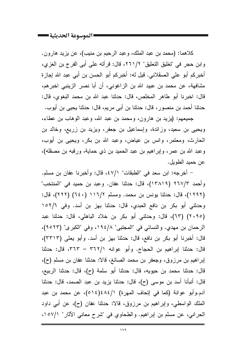 كلاهما: (محمد بن عبد الملك، وعبد الرحيم بن منيب)، عن يزيد هارون. وابن حجر في "تغليق التعليق" ٢/ ٢٦١، قال: قرأته على أبي الفرج بن الغزي، أخبركم أبو علي العسقلاني. قيل له: أخبركم أبو الحسن بن أبي عبد اللَّه إجازة مشافهة، عن محمد بن عبيد اللَّه بن الزاغوني، أن أبا نصر الزينبي أخبرهم، قال: أخبرنا أبو طاهر المخلص، قال: حدثنا عبد اللَّه بن محمد البغوي، قال: حدثنا أحمد بن منصور، قال: حدثنا بن أبي مريم، قال: حدثنا يحيى بن أيوب.