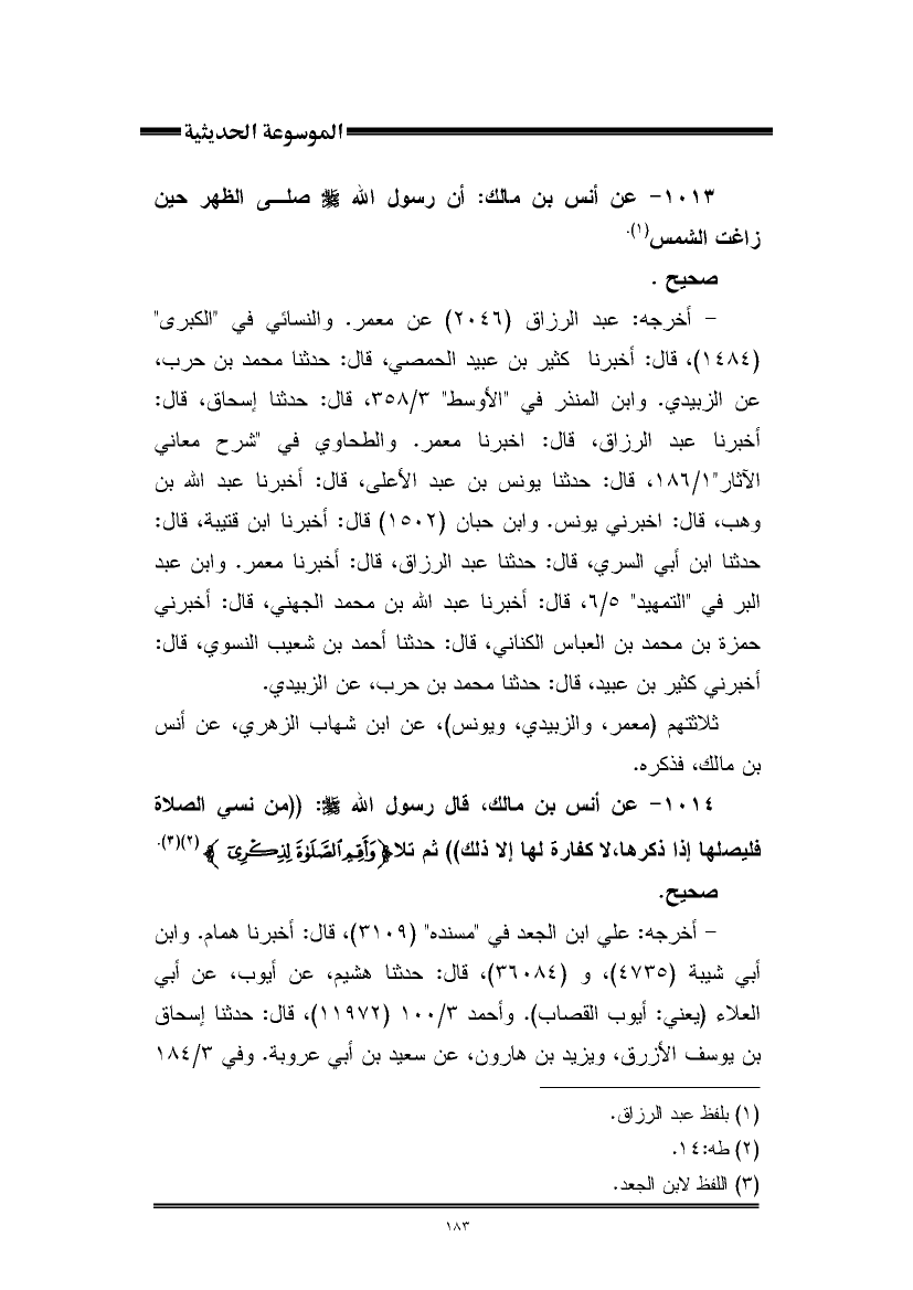 - أخرجه: عبد الرزاق (٢٠٤٦) عن معمر. والنسائي في "الكبرى" (١٤٨٤)، قال: أخبرنا كثير بن عبيد الحمصي، قال: حدثنا محمد بن حرب، عن الزبيدي. وابن المنذر في "الأوسط" ٣/ ٣٥٨، قال: حدثنا إسحاق، قال: أخبرنا عبد الرزاق، قال: أخبرنا معمر. والطحاوي في "شرح معاني الآثار" ١/ ١٨٦، قال: حدثنا يونس بن عبد الأعلى، قال: أخبرنا عبد اللَّه بن وهب، قال: أخبرني يونس. وابن حبان (١٥٠٢) قال: أخبرنا ابن قتيبة، قال: حدثنا ابن أبي السري، قال: حدثنا عبد الرزاق، قال: أخبرنا معمر. وابن عبد البر في "التمهيد" ٥/ ٦، قال: أخبرنا عبد اللَّه بن محمد الجهني، قال: أخبرني حمزة بن محمد بن العباس الكناني، قال: حدثنا أحمد بن شعيب النسوي، قال: أخبرني كثير بن عبيد، قال: حدثنا محمد بن حرب، عن الزبيدي.