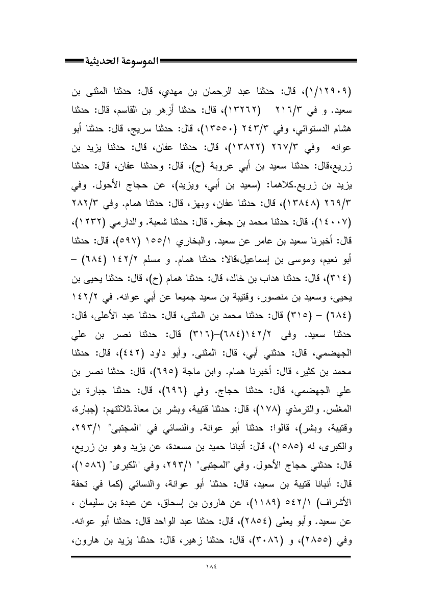 (١/ ١٢٩٠٩)، قال: حدثنا عبد الرحمان بن مهدي، قال: حدثنا المثنى بن سعيد. وفي ٣/ ٢١٦ (١٣٢٦٢)، قال: حدثنا أزهر بن القاسم، قال: حدثنا هشام الدستوائي، وفي ٣/ ٢٤٣ (١٣٥٥٠)، قال: حدثنا سريج، قال: حدثنا أبو عوانه وفي ٣/ ٢٦٧ (١٣٨٢٢)، قال: حدثنا عفان، قال: حدثنا يزيد بن زريع، قال: حدثنا سعيد بن أبي عروبة (ح)، قال: وحدثنا عفان، قال: حدثنا يزيد بن زريع. كلاهما: (سعيد بن أبي، ويزيد)، عن حجاج الأحول. وفي ٣/ ٢٦٩ (١٣٨٤٨)، قال: حدثنا عفان، وبهز، قال: حدثنا همام. وفي ٣/ ٢٨٢ (١٤٠٠٧)، قال: حدثنا محمد بن جعفر، قال: حدثنا شعبة. والدارمي (١٢٣٢)، قال: أخبرنا سعيد بن عامر عن سعيد. والبخاري ١/ ١٥٥ (٥٩٧)، قال: حدثنا أبو نعيم، وموسى بن إسماعيل، قالا: حدثنا همام. ومسلم ٢/ ١٤٢ (٦٨٤) - (٣١٤)، قال: حدثنا هداب بن خالد، قال: حدثنا همام (ح)، قال: حدثنا يحيى بن يحيى، وسعيد بن منصور، وقتيبة بن سعيد جميعا عن أبي عوانه. في ٢/ ١٤٢ (٦٨٤) - (٣١٥) قال: حدثنا محمد بن المثنى، قال: حدثنا عبد الأعلى، قال: حدثنا سعيد. وفي ٢/ ١٤٢ (٦٨٤) - (٣١٦) قال: حدثنا نصر بن علي الجهضمي، قال: حدثني أبي، قال: المثنى. وأبو داود (٤٤٢)، قال: حدثنا محمد بن كثير، قال: أخبرنا همام. وابن ماجة (٦٩٥)، قال: حدثنا نصر بن علي الجهضمي، قال: حدثنا حجاج. وفي (٦٩٦)، قال: حدثنا جبارة بن المغلس. والترمذي (١٧٨)، قال: حدثنا قتيبة، وبشر بن معاذ. ثلاثتهم: (جبارة، وقتيبة، وبشر)، قالوا: حدثنا أبو عوانة. والنسائي في "المجتبى" ١/ ٢٩٣، والكبرى، له (١٥٨٥)، قال: أنبأنا حميد بن مسعدة، عن يزيد وهو بن زريع، قال: حدثني حجاج الأحول. وفي "المجتبى" ١/ ٢٩٣، وفي "الكبرى" (١٥٨٦)، قال: أنبأنا قتيبة بن سعيد، قال: حدثنا أبو عوانة، والنسائي (كما في تحفة الأشراف) ١/ ٥٤٢ (١١٨٩)، عن هارون بن إسحاق، عن عبدة بن سليمان، عن سعيد. وأبو يعلى (٢٨٥٤)، قال: حدثنا عبد الواحد قال: حدثنا أبو عوانه. وفي (٢٨٥٥)، و (٣٠٨٦)، قال: حدثنا زهير، قال: حدثنا يزيد بن هارون،