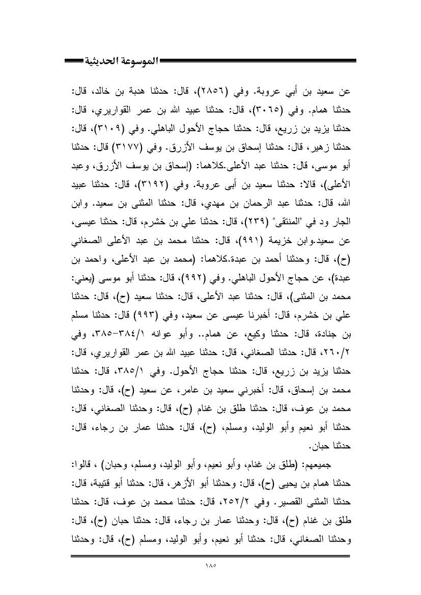 جميعهم: (طلق بن غنام، وأبو نعيم، وأبو الوليد، ومسلم، وحبان)، قالوا: حدثنا همام بن يحيى (ح)، قال: وحدثنا أبو الأزهر، قال: حدثنا أبو قتيبة، قال: حدثنا المثنى القصير. وفي ٢/ ٢٥٢، قال: حدثنا محمد بن عوف، قال: حدثنا طلق بن غنام (ح)، قال: وحدثنا عمار بن رجاء، قال: حدثنا حبان (ح)، قال: وحدثنا الصغاني، قال: حدثنا أبو نعيم، وأبو الوليد، ومسلم (ح)، قال: وحدثنا
