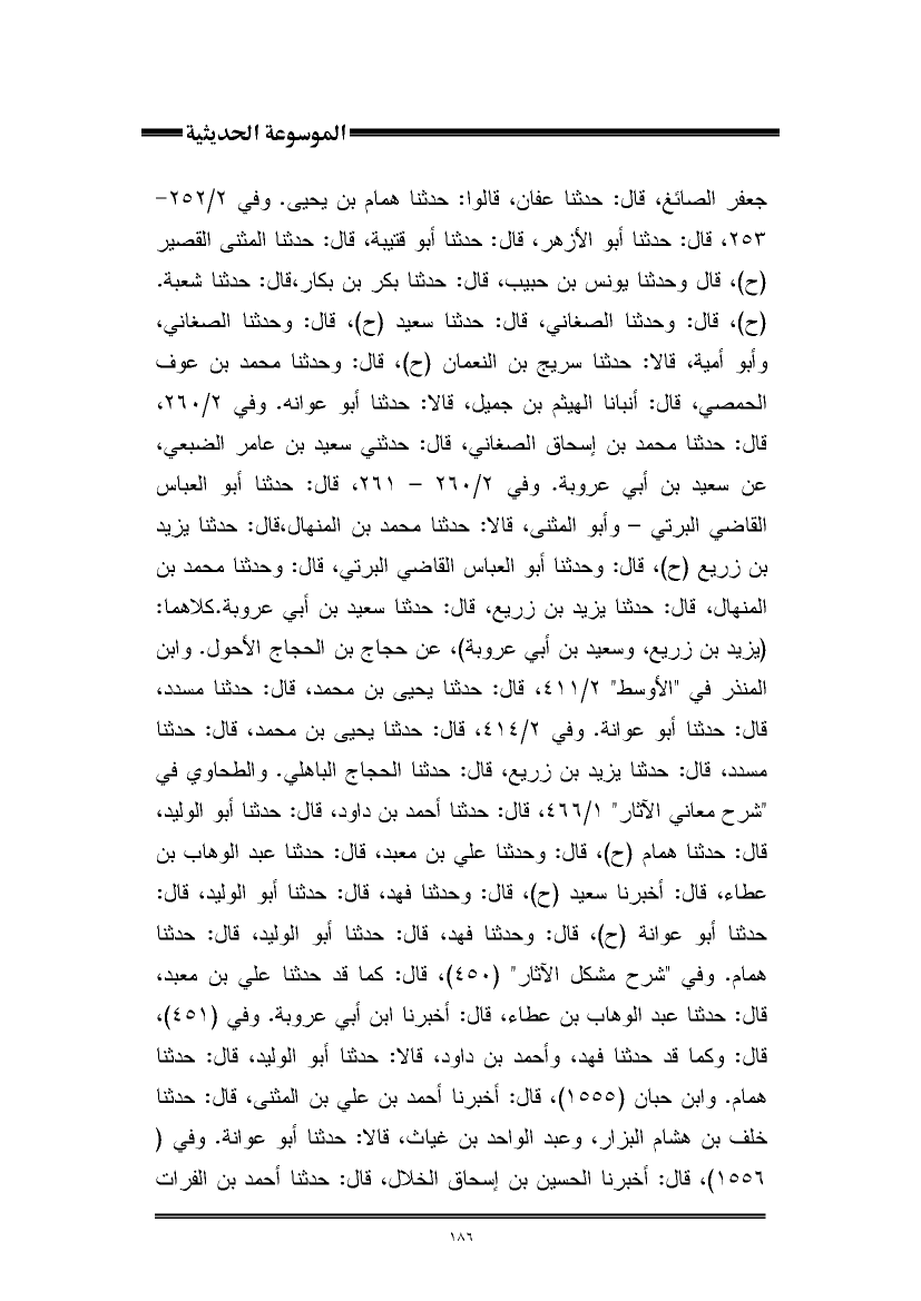 جعفر الصائغ، قال: حدثنا عفان، قالوا: حدثنا همام بن يحيى. وفي ٢/ ٢٥٢ - ٢٥٣، قال: حدثنا أبو الأزهر، قال: حدثنا أبو قتيبة، قال: حدثنا المثنى القصير (ح)، قال وحدثنا يونس بن حبيب، قال: حدثنا بكر بن بار، قال: حدثنا شعبة. (ح)، قال: وحدثنا الصغاني، قال: حدثنا سعيد (ح)، قال: وحدثنا الصغاني، وأبو أمية، قالا: حدثنا سريج بن النعمان (ح)، قال: وحدثنا محمد بن عوف الحمصي، قال: أنبأنا الهيثم بن جميل، قالا: حدثنا أبو عوانه. وفي ٢/ ٢٦٠، قال: حدثنا محمد بن إسحاق الصغاني، قال: حدثني سعيد بن عامر الضبعي، عن سعيد بن أبي عروبة. وفي ٢/ ٢٦٠ - ٢٦١، قال: حدثنا أبو العباس القاضي البرتي - وأبو المثنى، قالا: حدثنا محمد بن المنهال، قال: حدثنا يزيد بن زريع (ح)، قال: وحدثنا أبو العباس القاضي البرتي، قال: وحدثنا محمد بن المنهال، قال: حدثنا يزيد بن زريع، قال: حدثنا سعيد بن أبي عروبة. كلاهما: (يزيد بن زريع، وسعيد بن أبي عروبة)، عن حجاج بن الحجاج الأحول. وابن المنذر في "الأوسط" ٢/ ٤١١، قال: حدثنا يحيى بن محمد، قال: حدثنا مسدد، قال: حدثنا أبو عوانة. وفي ٢/ ٤١٤، قال: حدثنا يحيى بن محمد، قال: حدثنا مسدد، قال: حدثنا يزيد بن زريع، قال: حدثنا الحجاج الباهلي. والطحاوي في "شرح معاني الآثار" ١/ ٤٦٦، قال: حدثنا أحمد بن داود، قال: حدثنا أبو الوليد، قال: حدثنا همام (ح)، قال: وحدثنا علي بن معبد، قال: حدثنا عبد الوهاب بن عطاء، قال: أخبرنا سعيد (ح)، قال: وحدثنا فهد، قال: حدثنا أبو الوليد، قال: حدثنا أبو عوانة (ح)، قال: وحدثنا فهد، قال: حدثنا أبو الوليد، قال: حدثنا همام. وفي "شرح مشكل الآثار" (٤٥٠)، قال: كما قد حدثنا علي بن معبد، قال: حدثنا عبد الوهاب بن عطاء، قال: أخبرنا ابن أبي عروبة. وفي (٤٥١)، قال: وكما قد حدثنا فهد، وأحمد بن داود، قالا: حدثنا أبو الوليد، قال: حدثنا همام. وابن حبان (١٥٥٥)، قال: أخبرنا أحمد بن علي بن المثنى، قال: حدثنا خلف بن هشام البزار، وعبد الواحد بن غياث، قالا: حدثنا أبو عوانة. وفي (١٥٥٦)، قال: أخبرنا الحسين بن إسحاق الخلال، قال: حدثنا أحمد بن الفرات