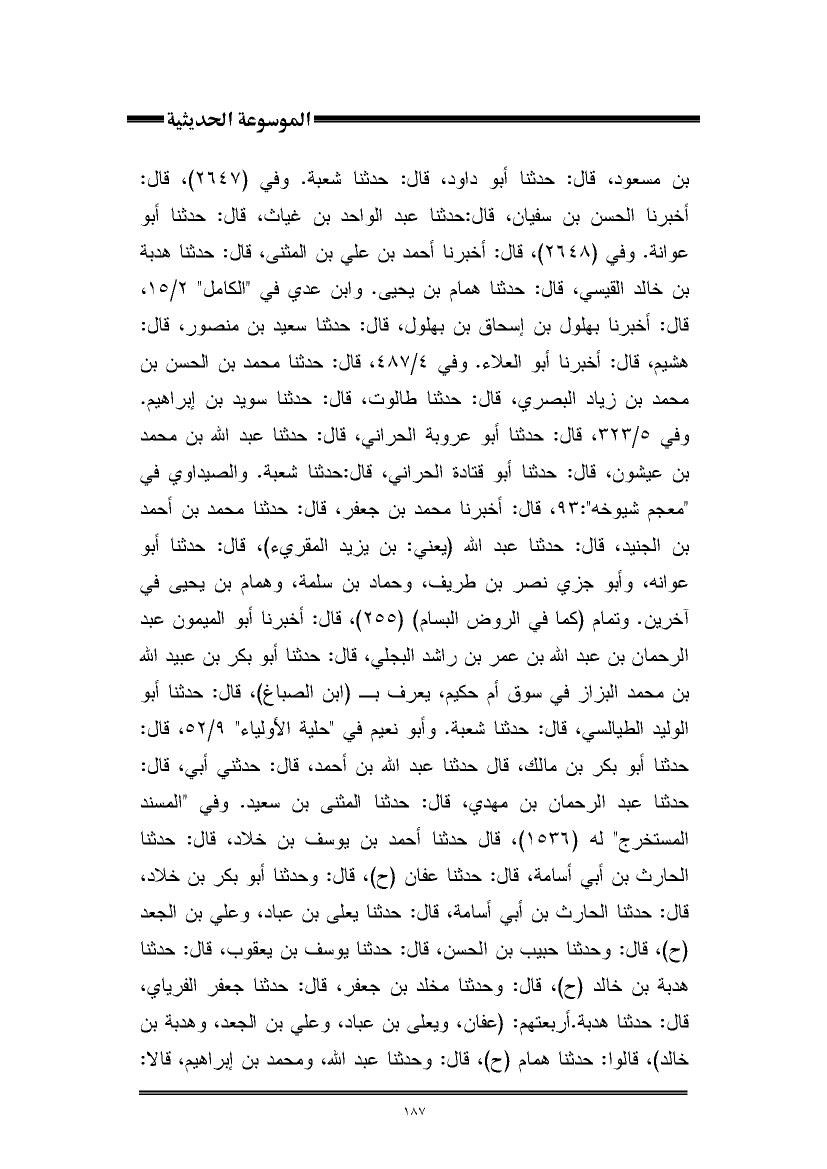بن مسعود، قال: حدثنا أبو داود، قال: حدثنا شعبة. وفي (٢٦٤٧)، قال: أخبرنا الحسن بن سفيان، قال: حدثنا عبد الواحد بن غياث، قال: حدثنا أبو عوانة. وفي (٢٦٤٨)، قال: أخبرنا أحمد بن علي بن المثنى، قال: حدثنا هدبة بن خالد القيسي، قال: حدثنا همام بن يحيى. وابن عدي في "الكامل" ٢/ ١٥، قال: أخبرنا بهلول بن إسحاق بن بهلول، قال: حدثنا سعيد بن منصور، قال: هشيم، قال: أخبرنا أبو العلاء. وفي ٤/ ٤٨٧، قال: حدثنا محمد بن الحسن بن محمد بن زياد البصري، قال: حدثنا طالوت، قال: حدثنا سويد بن إبراهيم. وفي ٥/ ٣٢٣، قال: حدثنا أبو عروبة الحراني، قال: حدثنا عبد اللَّه بن محمد بن عيشون، قال: حدثنا أبو قتادة الحراني، قال: حدثنا شعبة. والصيداوي في "معجم شيوخه": ٩٣، قال: أخبرنا محمد بن جعفر، قال: حدثنا محمد بن أحمد بن الجنيد، قال: حدثنا عبد اللَّه (يعني: بن يزيد المقريء)، قال: حدثنا أبو عوانه، وأبو جزي نصر بن طريف، وحماد بن سلمة، وهمام بن يحيى في آخرين. وتمام (كما في الروض البسام) (٢٥٥)، قال: أخبرنا أبو الميمون عبد الرحمان بن عبد اللَّه بن عمر بن راشد البجلي، قال: حدثنا أبو بكر بن عبيد اللَّه بن محمد البزاز في سوق أم حكيم، يعرف بـ (ابن الصباغ)، قال: حدثنا أبو الوليد الطيالسي، قال: حدثنا شعبة. وأبو نعيم في "حلية الأولياء" ٩/ ٥٢، قال: حدثنا أبو بكر بن مالك، قال حدثنا عبد اللَّه بن أحمد، قال: حدثني أبي، قال: حدثنا عبد الرحمان بن مهدي، قال: حدثنا المثنى بن سعيد. وفي "المسند المستخرج" له (١٥٣٦)، قال حدثنا أحمد بن يوسف بن خلاد، قال: حدثنا الحارث بن أبي أسامة، قال: حدثنا عفان (ح)، قال: وحدثنا أبو بكر بن خلاد، قال: حدثنا الحارث بن أبي أسامة، قال: حدثنا يعلى بن عباد، وعلي بن الجعد (ح)، قال: وحدثنا حبيب بن الحسن، قال: حدثنا يوسف بن يعقوب، قال: حدثنا هدبة بن خالد (ح)، قال: وحدثنا مخلد بن جعفر، قال: حدثنا جعفر الفريابي، قال: حدثنا هدبة. أربعتهم: (عفان، ويعلى بن عباد، وعلي بن الجعد، وهدبة بن خالد)، قالوا: حدثنا همام (ح)، قال: وحدثنا عبد اللَّه، ومحمد بن إبراهيم، قالا:
