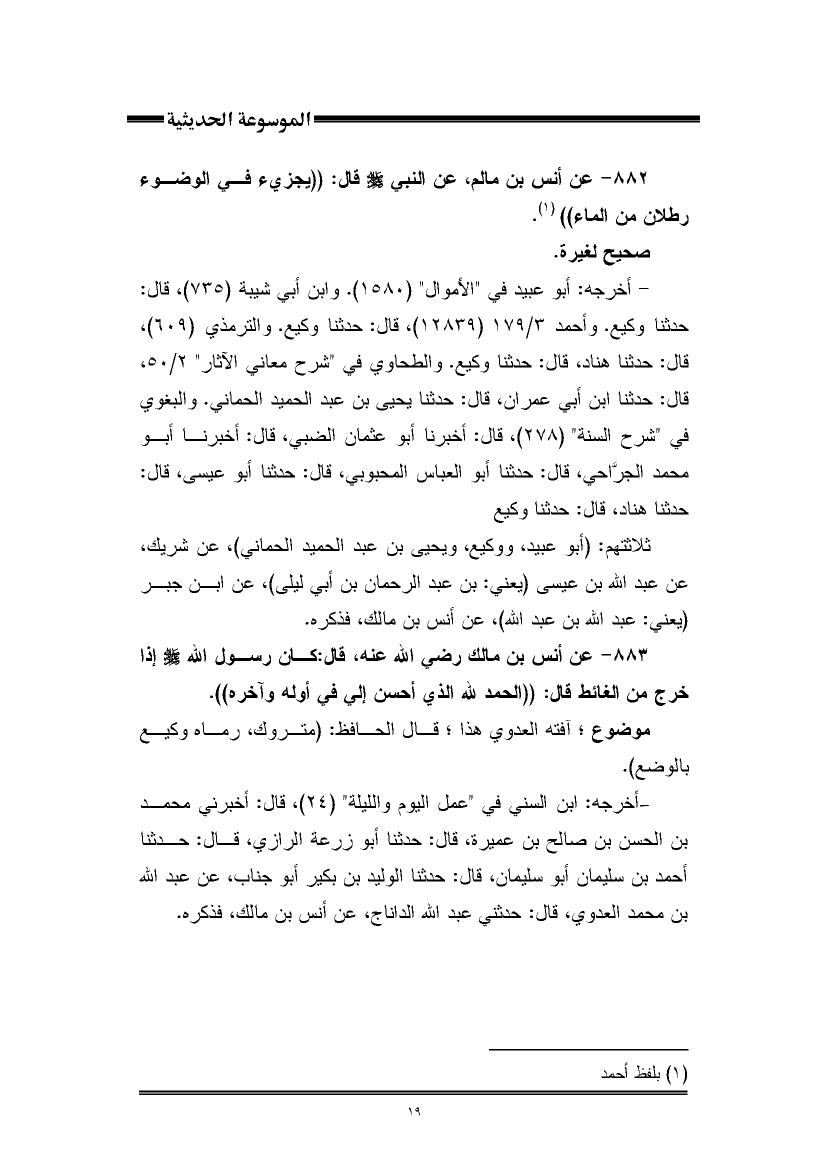 ٨٨٢ - عن أنس بن مالك، عن النبي -صلى اللَّه عليه وسلم- قال: "يجزيء في الوضوء رطلان من الماء" (¬١).