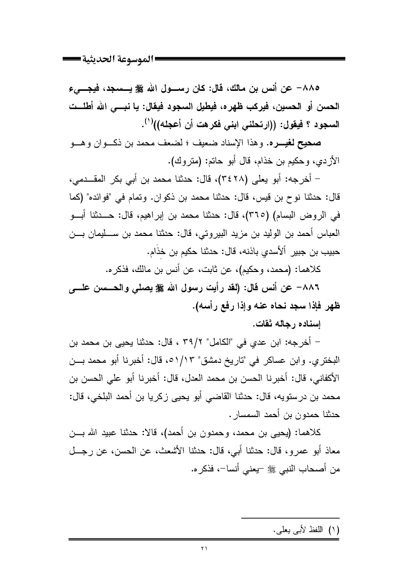 ٨٨٥ - عن أنس بن مالك، قال: كان رسول اللَّه -صلى اللَّه عليه وسلم- يسجد، فيجيء الحسن أو الحسين، فيركب ظهره، فيطيل السجود فيقال: يا نبي اللَّه أطلت السجود؟ فيفول: "ارتحلني ابني فكرهت أن أعجله" (¬١).