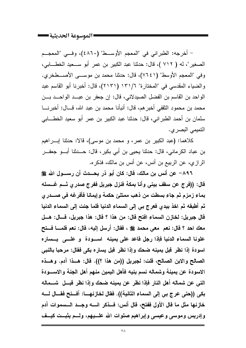 ٨٩٦ - عن أنس بن مالك، قال: كان أبو ذر يحدث أن رسول اللَّه -صلى اللَّه عليه وسلم- قال: "فرج عن سقف بيتي وأنا بمكة فنزل جبريل ففرج صدري ثم غسله بماء زمزم ثم جاء بسطت من ذهب ممتلئ حكمة وإيمانا فأفرغه في صدري ثم أطبقه ثم أخذ بيدي فعرج بي إلى السماء الدنيا فلما جئت إلى السماء الدنيا قال جبريل: لخازن السماء افتح قال: من هذا؟ قال: هذا جبريل، قال: هل معك أحد؟ قال: نعم معي محمد - صلى الله عليه وسلم -، فقال: أرسل إليه، قال: نعم فلما فتح علونا السماء الدنيا فإذا رجل فاعد على يمينه اسودة وعلى يساره اسودة إذا نظر فبل يمينه ضحك وإذا نظر قبل يساره بكى فقال: مرحبا بالنبي الصالح والابن الصالح، قلت: لجبريل "من هذا؟ ". قال: هذا آدم. وهذه الاسودة عن يمينة وشماله نسم بنيه فأهل اليمين منهم أهل الجنة والاسودة التي عن شماله أهل النار فإذا نظر عن يمينه ضحك وإذا نظر قبل شماله بكى "حتى عرج بي إلى السماء الثانية". فقال لخازنها: أفتح فقال له خازنها مثل ما قال الأول ففتح، قال أنس: فذكر أنه وجد السموات آدم وإدريس وموسى وعيسى وإبراهيم صلوات اللَّه عليهم، ولم يثبت كيف