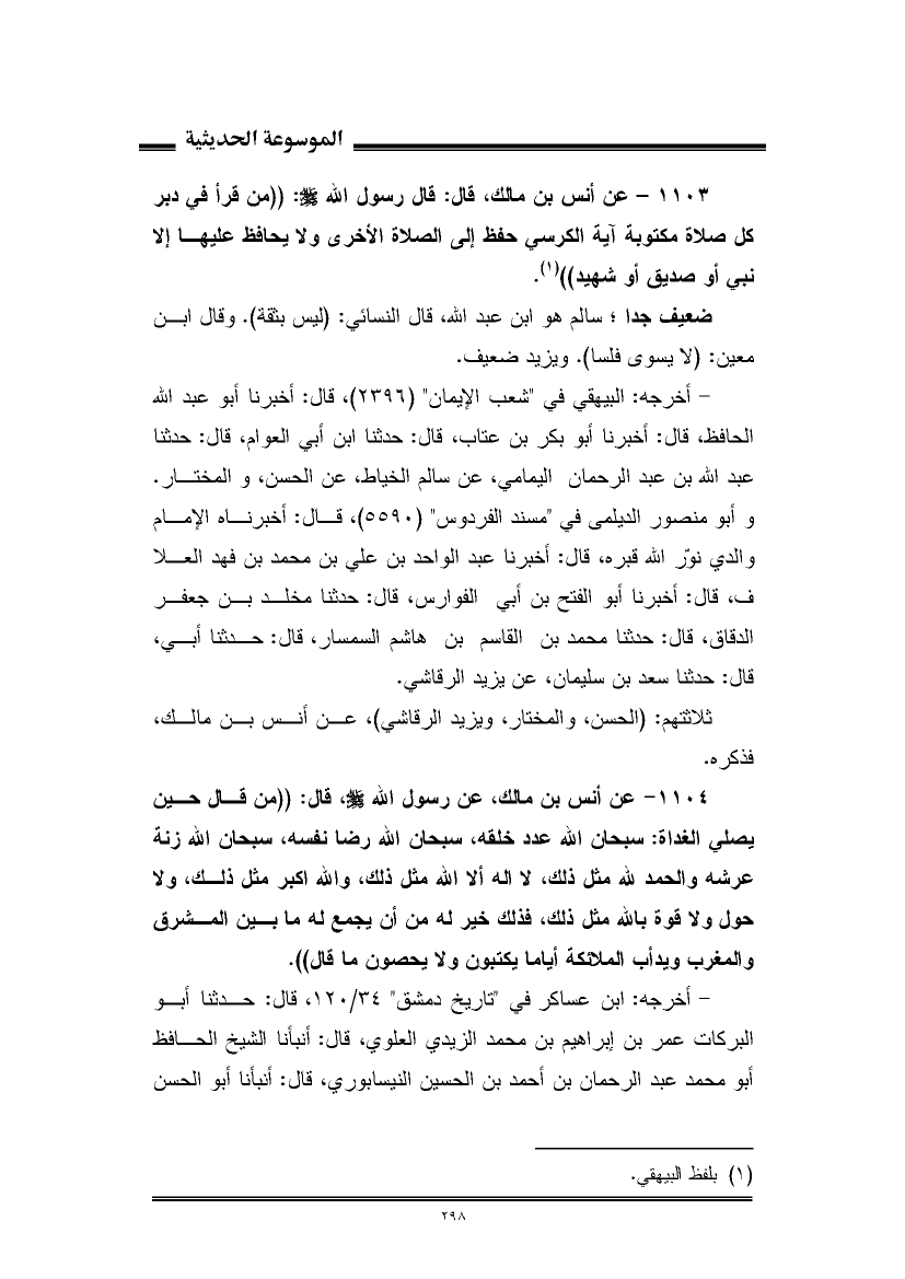 ١١٠٣ - عن أنس بن مالك، قال: قال رسول الله - صلى الله عليه وسلم -: "من قرأ في دبر كل صلاة مكتوبة آية الكرسي حفظ إلى الصلاة الأخرى ولا يحافظ عليها إلا نبي أو صديق أو شهيد" (¬١).