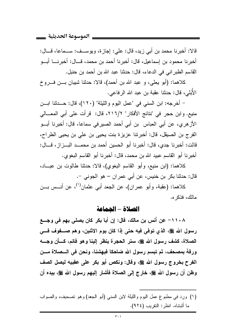 ١١٠٨ - عن أنس بن مالك، قال: إن أبا بكر كان يصلي بهم في وجع رسول الله - صلى الله عليه وسلم -، الذي توفي فيه حتى إذا كان يوم الاثنين، وهم صفوف في الصلاة، كشف رسول الله - صلى الله عليه وسلم -، ستر الحجرة ينظر إلينا وهو قائم، كأن وجه ورقة بمصحف، ثم تبسم رسول الله ضاحكا فبهشنا، ونحن في الصلاة من الفرح بخروج رسول الله - صلى الله عليه وسلم -، وقال: ونكص أبو بكر على عقبيه ليصل الصف وظن أن رسول الله - صلى الله عليه وسلم -، خارج إلى الصلاة فأشار إليهم رسول الله - صلى الله عليه وسلم -، بيده أن