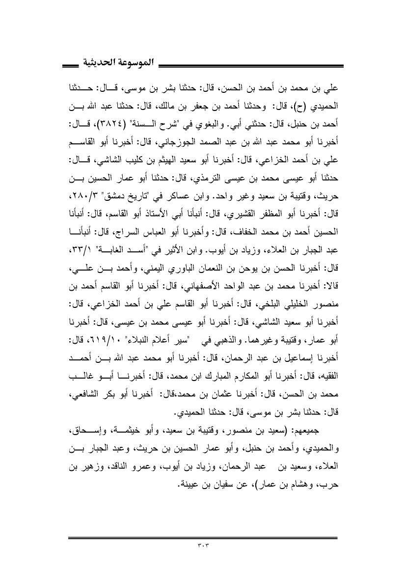 علي بن محمد بن أحمد بن الحسن، قال: حدثنا بشر بن موسى، قال: حدثنا الحميدي (ح)، قال: وحدثنا أحمد بن جعفر بن مالك، قال: حدثنا عبد الله بن أحمد بن حنبل، قال: حدثني أبي. والبغوي في "شرح السنة" (٣٨٢٤)، قال: أخبرنا أبو محمد عبد الله بن عبد الصمد الجوزجاني، قال: أخبرنا أبو القاسم علي بن أحمد الخزاعي، قال: أخبرنا أبو سعيد الهيثم بن كليب الشاشي، قال: حدثنا أبو عيسى محمد بن عيسى الترمذي، قال: حدثنا أبو عمار الحسين بن حريث، وقتيبة بن سعيد وغير واحد. وابن عساكر في "تاريخ دمشق" ٣/ ٢٨٠، قال: أخبرنا أبو المظفر القشيري، قال: أنبأنا أبي الأستاذ أبو القاسم، قال: أنبأنا الحسين أحمد بن محمد الخفاف، قال: وأخبرنا أبو العباس السراج، قال: أنبأنا عبد الجبار بن العلاء، وزياد بن أيوب. وابن الأثير في "أسد الغابة" ١/ ٣٣، قال: أخبرنا الحسن بن يوحن بن النعمان الباوري اليمني، وأحمد بن علي، قالا: أخبرنا محمد بن عبد الواحد الأصفهاني، قال: أخبرنا أبو القاسم أحمد بن منصور الخليلي البلخي، قال: أخبرنا أبو القاسم علي بن أحمد الخزاعي، قال: أخبرنا أبو سعيد الشاشي، قال: أخبرنا أبو عيسى محمد بن عيسى، قال: أخبرنا أبو عمار، وقتيبة وغيرهما. والذهبي في "سير أعلام النبلاء" ١٠/ ٦١٩، قال: أخبرنا إسماعيل بن عبد الرحمان، قال: أخبرنا أبو محمد عبد الله بن أحمد الفقيه، قال: أخبرنا أبو المكارم المبارك ابن محمد، قال: أخبرنا أبو غالب محمد بن الحسن، قال: أخبرنا عثمان بن محمد، قال: أخبرنا أبو بكر الشافعي، قال: حدثنا بشر بن موسى، قال: حدثنا الحميدي.