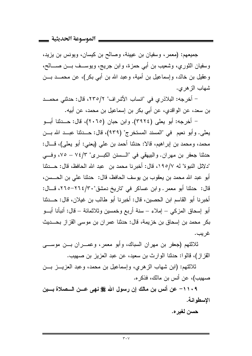 ١١٠٩ - عن أنس بن مالك إن رسول الله - صلى الله عليه وسلم - نهى عن الصلاة بين الإسطوانة.