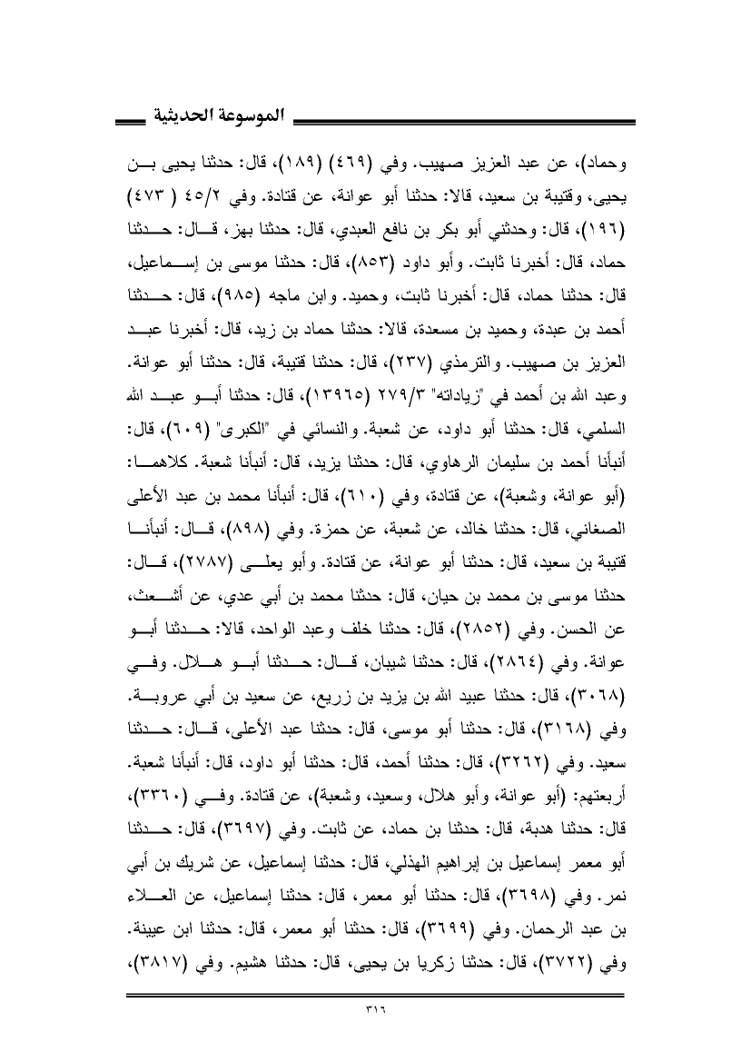 وحماد)، عن عبد العزيز صهيب. وفي (٤٦٩) (١٨٩)، قال: حدثنا يحيى بن يحيى، وقتيبة بن سعيد، قالا: حدثنا أبو عوانة، عن قتادة. وفي ٢/ ٤٥ (٤٧٣) (١٩٦)، قال: وحدثني أبو بكر بن نافع العبدي، قال: حدثنا بهز، قال: حدثنا حماد، قال: أخبرنا ثابت. وأبو داود (٨٥٣)، قال: حدثنا موسى بن إسماعيل، قال: حدثنا حماد، قال: أخبرنا ثابت، وحميد. وابن ماجه (٩٨٥)، قال: حدثنا أحمد بن عبدة، وحميد بن مسعدة، قالا: حدثنا حماد بن زيد، قال: أخبرنا عبد العزيز بن صهيب. والترمذي (٢٣٧)، قال: حدثنا قتيبة، قال: حدثنا أبو عوانة. وعبد الله بن أحمد في "زياداته" ٣/ ٢٧٩ (١٣٩٦٥)، قال: حدثنا أبو عبد الله السلمي، قال: حدثنا أبو داود، عن شعبة. والنسائي في "الكبرى" (٦٠٩)، قال: أنبأنا أحمد بن سليمان الرهاوي، قال: حدثنا يزيد، قال: أنبأنا شعبة. كلاهما: (أبو عوانة، وشعبة)، عن قتادة، وفي (٦١٠)، قال: أنبأنا محمد بن عبد الأعلى الصغاني، قال: حدثنا خالد، عن شعبة، عن حمزة. وفي (٨٩٨)، قال: أنبأنا قتيبة بن سعيد، قال: حدثنا أبو عوانة، عن قتادة. وأبو يعلى (٢٧٨٧)، قال: حدثنا موسى بن محمد بن حيان، قال: حدثنا محمد بن أبي عدي، عن أشعث، عن الحسن. وفي (٢٨٥٢)، قال: حدثنا خلف وعبد الواحد، قالا: حدثنا أبو عوانة. وفي (٢٨٦٤)، قال: حدثنا شيبان، قال: حدثنا أبو هلال. وفي (٣٠٦٨)، قال: حدثنا عبيد الله بن يزيد بن زريع، عن سعيد بن أبي عروبة. وفي (٣١٦٨)، قال: حدثنا أبو موسى، قال: حدثنا عبد الأعلى، قال: حدثنا سعيد. وفي (٣٢٦٢)، قال: حدثنا أحمد، قال: حدثنا أبو داود، قال: أنبأنا شعبة. أربعتهم: (أبو عوانة، وأبو هلال، وسعيد، وشعبة)، عن قتادة. وفي (٣٣٦٠)، قال: حدثنا هدبة، قال: حدثنا بن حماد، عن ثابت. وفي (٣٦٩٧)، قال: حدثنا أبو معمر إسماعيل بن إبراهيم الهذلي، قال: حدثنا إسماعيل، عن شريك بن أبي نمر. وفي (٣٦٩٨)، قال: حدثنا أبو معمر، قال: حدثنا إسماعيل، عن العلاء بن عبد الرحمان. وفي (٣٦٩٩)، قال: حدثنا أبو معمر، قال: حدثنا ابن عيينة. وفي (٣٧٢٢)، قال: حدثنا زكريا بن يحيى، قال: حدثنا هشيم. وفي (٣٨١٧)،