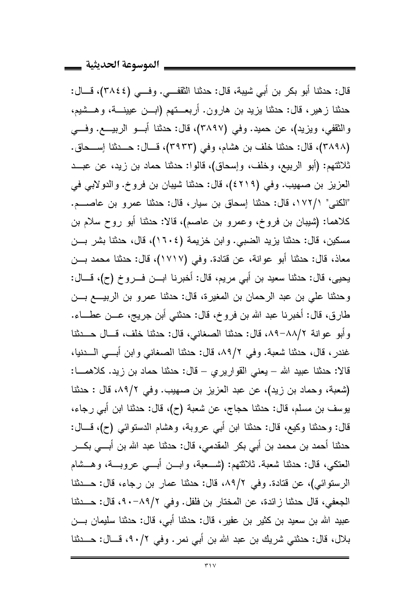 قال: حدثنا أبو بكر بن أبي شيبة، قال: حدثنا الثقفي. وفي (٣٨٤٤)، قال: حدثنا زهير، قال: حدثنا يزيد بن هارون. أربعتهم (ابن عيينة، وهشيم، والثقفي، ويزيد)، عن حميد. وفي (٣٨٩٧)، قال: حدثنا أبو الربيع. وفي (٣٨٩٨)، قال: حدثنا خلف بن هشام، وفي (٣٩٣٣)، قال: حدثنا إسحاق. ثلاثتهم: (أبو الربيع، وخلف، وإسحاق)، قالوا: حدثنا حماد بن زيد، عن عبد العزيز بن صهيب. وفي (٤٢١٩)، قال: حدثنا شيبان بن فروخ. والدولابي في "الكنى" ١/ ١٧٢، قال: حدثنا إسحاق بن سيار، قال: حدثنا عمرو بن عاصم. كلاهما: (شيبان بن فروخ، وعمرو بن عاصم)، قالا: حدثنا أبو روح سلام بن مسكين، قال: حدثنا يزيد الضبي. وابن خزيمة (١٦٠٤)، قال، حدثنا بشر بن معاذ، قال: حدثنا أبو عوانة، عن قتادة. وفي (١٧١٧)، قال: حدثنا محمد بن يحيى، قال: حدثنا سعيد بن أبي مريم، قال: أخبرنا ابن فروخ (ح)، قال: وحدثنا علي بن عبد الرحمان بن المغيرة، قال: حدثنا عمرو بن الربيع بن طارق، قال: أخبرنا عبد الله بن فروخ، قال: حدثني ابن جريج، عن عطاء. وأبو عوانة ٢/ ٨٨ - ٨٩، قال: حدثنا الصغاني، قال: حدثنا خلف، قال حدثنا غندر، قال، حدثنا شعبة. وفي ٢/ ٨٩، قال: حدثنا الصغاني وابن أبي الدنيا، قالا: حدثنا عبيد الله - يعني القواريري - قال: حدثنا حماد بن زيد. كلاهما: (شعبة، وحماد بن زيد)، عن عبد العزيز بن صهيب. وفي ٢/ ٨٩، قال: حدثنا يوسف بن مسلم، قال: حدثنا حجاج، عن شعبة (ح)، قال: حدثنا ابن أبي رجاء، قال: وحدثنا وكيع، قال: حدثنا ابن أبي عروبة، وهشام الدستوائي (ح)، قال: حدثنا أحمد بن محمد بن أبي بكر المقدمي، قال: حدثنا عبد الله بن أبي بكر العتكي، قال: حدثنا شعبة. ثلاثتهم: (شعبة، وابن أبي عروبة، وهشام الرستوائي)، عن قتادة. وفي ٢/ ٨٩، قال: حدثنا عمار بن رجاء، قال: حدثنا الجعفي، قال حدثنا زائدة، عن المختار بن فلفل. وفي ٢/ ٨٩ - ٩٠، قال: حدثنا عبيد الله بن سعيد بن كثير بن عفير، قال: حدثنا أبي، قال: حدثنا سليمان بن بلال، قال: حدثني شريك بن عبد الله بن أبي نمر. وفي ٢/ ٩٠، قال: حدثنا
