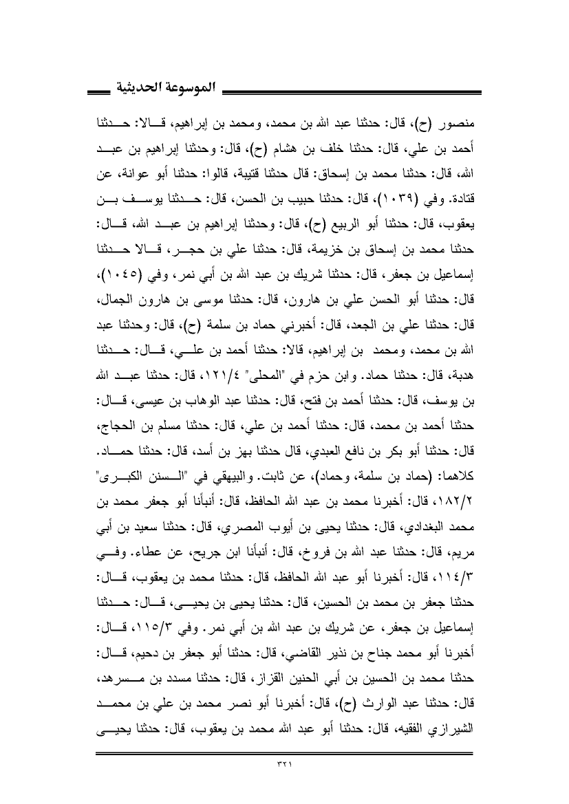 منصور (ح)، قال: حدثنا عبد الله بن محمد، ومحمد بن إبراهيم، قالا: حدثنا أحمد بن علي، قال: حدثنا خلف بن هشام (ح)، قال: وحدثنا إبراهيم بن عبد الله، قال: حدثنا محمد بن إسحاق: قال حدثنا قتيبة، قالوا: حدثنا أبو عوانة، عن قتادة. وفي (١٠٣٩)، قال: حدثنا حبيب بن الحسن، قال: حدثنا يوسف بن يعقوب، قال: حدثنا أبو الربيع (ح)، قال: وحدثنا إبراهيم بن عبد الله، قال: حدثنا محمد بن إسحاق بن خزيمة، قال: حدثنا علي بن حجر، قالا حدثنا إسماعيل بن جعفر، قال: حدثنا شريك بن عبد الله بن أبي نمر، وفي (١٠٤٥)، قال: حدثنا أبو الحسن علي بن هارون، قال: حدثنا موسى بن هارون الجمال، قال: حدثنا علي بن الجعد، قال: أخبرني حماد بن سلمة (ح)، قال: وحدثنا عبد الله بن محمد، ومحمد بن إبراهيم، قالا: حدثنا أحمد بن علي، قال: حدثنا هدبة، قال: حدثنا حماد. وابن حزم في "المحلى" ٤/ ١٢١، قال: حدثنا عبد الله بن يوسف، قال: حدثنا أحمد بن فتح، قال: حدثنا عبد الوهاب بن عيسى، قال: حدثنا أحمد بن محمد، قال: حدثنا أحمد بن علي، قال: حدثنا مسلم بن الحجاج، قال: حدثنا أبو بكر بن نافع العبدي، قال حدثنا بهز بن أسد، قال: حدثنا حماد.