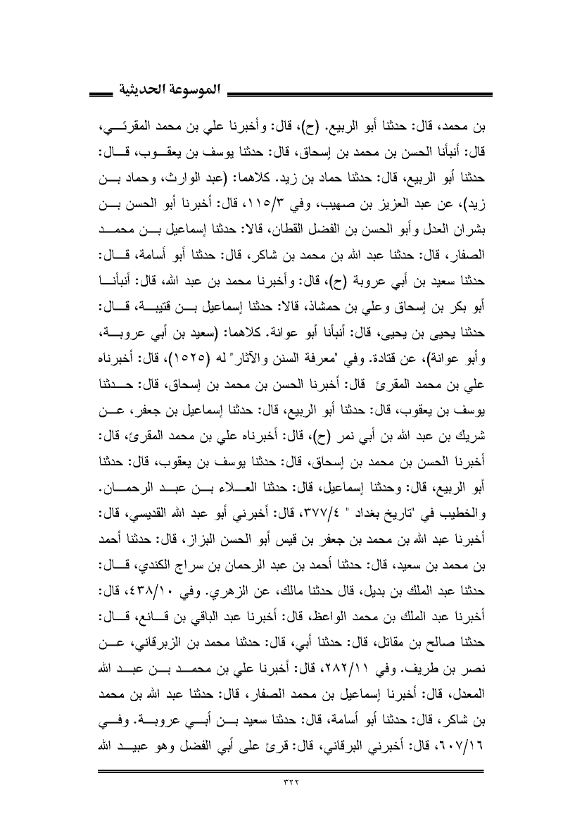 بن محمد، قال: حدثنا أبو الربيع. (ح)، قال: وأخبرنا علي بن محمد المقرئي، قال: أنبأنا الحسن بن محمد بن إسحاق، قال: حدثنا يوسف بن يعقوب، قال: حدثنا أبو الربيع، قال: حدثنا حماد بن زيد. كلاهما: (عبد الوارث، وحماد بن زيد)، عن عبد العزيز بن صهيب، وفي ٣/ ١١٥، قال: أخبرنا أبو الحسن بن بشران العدل وأبو الحسن بن الفضل القطان، قالا: حدثنا إسماعيل بن محمد الصفار، قال: حدثنا عبد الله بن محمد بن شاكر، قال: حدثنا أبو أسامة، قال: حدثنا سعيد بن أبي عروبة (ح)، قال: وأخبرنا محمد بن عبد الله، قال: أنبأنا أبو بكر بن إسحاق وعلي بن حمشاذ، قالا: حدثنا إسماعيل بن قتيبة، قال: حدثنا يحيى بن يحيى، قال: أنبأنا أبو عوانة. كلاهما: (سعيد بن أبي عروبة، وأبو عوانة)، عن قتادة. وفي "معرفة السنن والآثار" له (١٥٢٥)، قال: أخبرناه علي بن محمد المقرئ قال: أخبرنا الحسن بن محمد بن إسحاق، قال: حدثنا يوسف بن يعقوب، قال: حدثنا أبو الربيع، قال: حدثنا إسماعيل بن جعفر، عن شريك بن عبد الله بن أبي نمر (ح)، قال: أخبرناه علي بن محمد المقرئ، قال: أخبرنا الحسن بن محمد بن إسحاق، قال: حدثنا يوسف بن يعقوب، قال: حدثنا أبو الربيع، قال: وحدثنا إسماعيل، قال: حدثنا العلاء بن عبد الرحمان.
