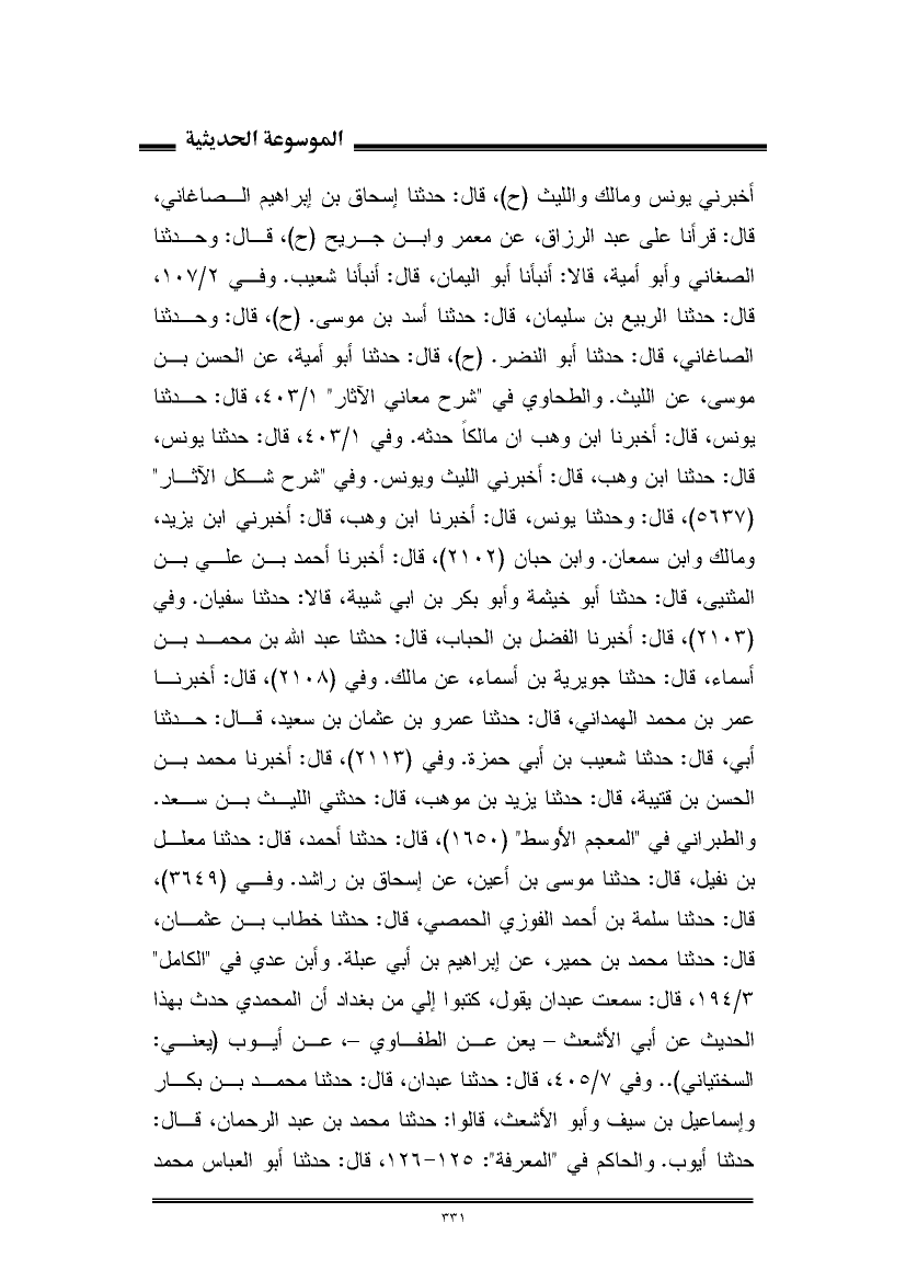أخبرني يونس ومالك والليث (ح)، قال: حدثنا إسحاق بن إبراهيم الصاغاني، قال: قرأنا على عبد الرزاق، عن معمر وابن جريح (ح)، قال: وحدثنا الصغاني وأبو أمية، قالا: أنبأنا أبو اليمان، قال: أنبأنا شعيب. وفي ٢/ ١٠٧، قال: حدثنا الربيع بن سليمان، قال: حدثنا أسد بن موسى. (ح)، قال: وحدثنا الصاغاني، قال: حدثنا أبو النضر. (ح)، قال: حدثنا أبو أمية، عن الحسن بن موسى، عن الليث. والطحاوي في "شرح معاني الآثار" ١/ ٤٠٣، قال: حدثنا يونس، قال: أخبرنا ابن وهب أن مالكًا حدثه. وفي ١/ ٤٠٣، قال: حدثنا يونس، قال: حدثنا ابن وهب، قال: أخبرني الليث ويونس. وفي "شرح شكل الآثار" (٥٦٣٧)، قال: وحدثنا يونس، قال: أخبرنا ابن وهب، قال: أخبرني ابن يزيد، ومالك وابن سمعان. وابن حبان (٢١٠٢)، قال: أخبرنا أحمد بن علي بن المثنى، قال: حدثنا أبو خيثمة وأبو بكر بن أبي شيبة، قالا: حدثنا سفيان. وفي (٢١٠٣)، قال: أخبرنا الفضل بن الحباب، قال: حدثنا عبد الله بن محمد بن أسماء، قال: حدثنا جويرية بن أسماء، عن مالك. وفي (٢١٠٨)، قال: أخبرنا عمر بن محمد الهمداني، قال: حدثنا عمرو بن عثمان بن سعيد، قال: حدثنا أبي، قال: حدثنا شعيب بن أبي حمزة. وفي (٢١١٣)، قال: أخبرنا محمد بن الحسن بن قتيبة، قال: حدثنا يزيد بن موهب، قال: حدثني الليث بن سعد. والطبراني في "المعجم الأوسط" (١٦٥٠)، قال: حدثنا أحمد، قال: حدثنا معلل بن نفيل، قال: حدثنا موسى بن أعين، عن إسحاق بن راشد. وفي (٣٦٤٩)، قال: حدثنا سلمة بن أحمد الفوزي الحمصي، قال: حدثنا خطاب بن عثمان، قال: حدثنا محمد بن حمير، عن إبراهيم بن أبي عبلة. وابن عدي في "الكامل" ٣/ ١٩٤، قال: سمعت عبدان يقول، كتبوا إلي من بغداد أن المحمدي حدث بهذا الحديث عن أبي الأشعث - يعني عن الطفاوي -، عن أيوب (يعني: السختياني) .. وفي ٧/ ٤٠٥، قال: حدثنا عبدان، قال: حدثنا محمد بن بكار وإسماعيل بن سيف وأبو الأشعث، قالوا: حدثنا محمد بن عبد الرحمان، قال: حدثنا أيوب. والحاكم في "المعرفة": ١٢٥ - ١٢٦، قال: حدثنا أبو العباس محمد