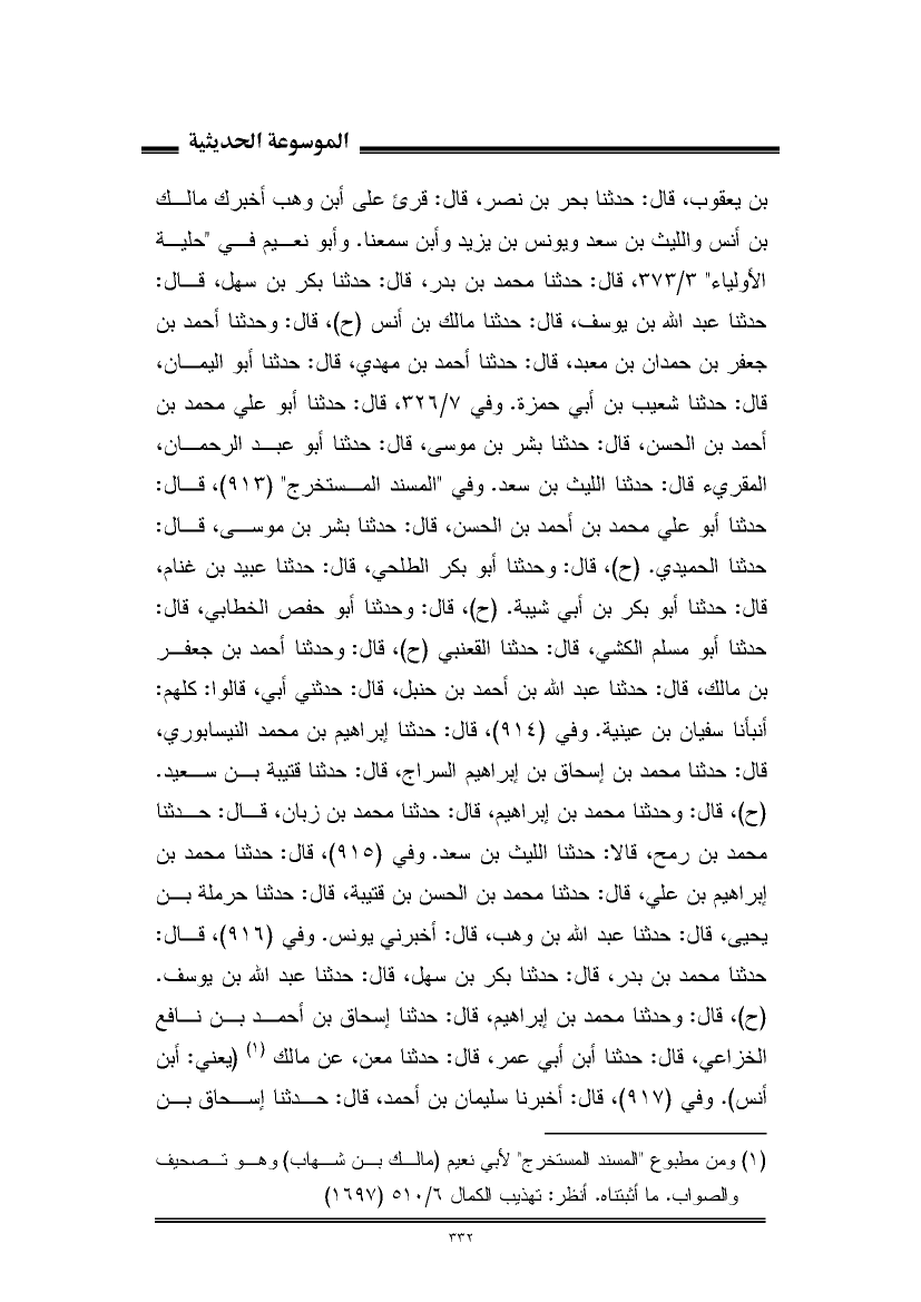 بن يعقوب، قال: حدثنا بحر بن نصر، قال: قرئ على ابن وهب أخبرك مالك بن أنس والليث بن سعد ويونس بن يزيد وابن سمعنا. وأبو نعيم في "حلية الأولياء" ٣/ ٣٧٣، قال: حدثنا محمد بن بدر، قال: حدثنا بكر بن سهل، قال: حدثنا عبد الله بن يوسف، قال: حدثنا مالك بن أنس (ح)، قال: وحدثنا أحمد بن جعفر بن حمدان بن معبد، قال: حدثنا أحمد بن مهدي، قال: حدثنا أبو اليمان، قال: حدثنا شعيب بن أبي حمزة. وفي ٧/ ٣٢٦، قال: حدثنا أبو علي محمد بن أحمد بن الحسن، قال: حدثنا بشر بن موسى، قال: حدثنا أبو عبد الرحمان، المقريء قال: حدثنا الليث بن سعد. وفي "المسند المستخرج" (٩١٣)، قال: حدثنا أبو علي محمد بن أحمد بن الحسن، قال: حدثنا بشر بن موسى، قال: حدثنا الحميدي. (ح)، قال: وحدثنا أبو بكر الطلحي، قال: حدثنا عبيد بن غنام، قال: حدثنا أبو بكر بن أبي شيبة. (ح)، قال: وحدثنا أبو حفص الخطابي، قال: حدثنا أبو مسلم الشي، قال: حدثنا القعنبي (ح)، قال: وحدثنا أحمد بن جعفر بن مالك، قال: حدثنا عبد الله بن أحمد بن حنبل، قال: حدثني أبي، قالوا: كلهم: أنبأنا سفيان بن عينية. وفي (٩١٤)، قال: حدثنا إبراهيم بن محمد النيسابوري، قال: حدثنا محمد بن إسحاق بن إبراهيم السراج، قال: حدثنا قتيبة بن سعيد. (ح)، قال: وحدثنا محمد بن إبراهيم، قال: حدثنا محمد بن زبان، قال: حدثنا محمد بن رمح، قالا: حدثنا الليث بن سعد. وفي (٩١٥)، قال: حدثنا محمد بن إبراهيم بن علي، قال: حدثنا محمد بن الحسن بن قتيبة، قال: حدثنا حرملة بن يحيى، قال: حدثنا عبد الله بن وهب، قال: أخبرني يونس. وفي (٩١٦)، قال: حدثنا محمد بن بدر، قال: حدثنا بكر بن سهل، قال: حدثنا عبد الله بن يوسف. (ح)، قال: وحدثنا محمد بن إبراهيم، قال: حدثنا إسحاق بن أحمد بن نافع الخزاعي، قال: حدثنا ابن أبي عمر، قال: حدثنا معن، عن مالك (¬١) (يعني: ابن أنس). وفي (٩١٧)، قال: أخبرنا سليمان بن أحمد، قال: حدثنا إسحاق بن
