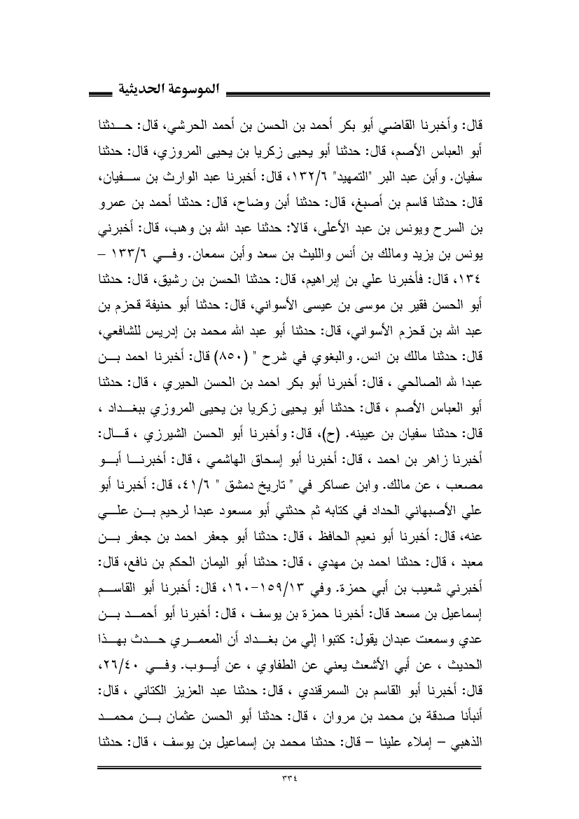 قال: وأخبرنا القاضي أبو بكر أحمد بن الحسن بن أحمد الحرشي، قال: حدثنا أبو العباس الأصم، قال: حدثنا أبو يحيى زكريا بن يحيى المروزي، قال: حدثنا سفيان. وابن عبد البر "التمهيد" ٦/ ١٣٢، قال: أخبرنا عبد الوارث بن سفيان، قال: حدثنا قاسم بن أصبغ، قال: حدثنا ابن وضاح، قال: حدثنا أحمد بن عمرو بن السرح ويونس بن عبد الأعلى، قالا: حدثنا عبد الله بن وهب، قال: أخبرني يونس بن يزيد ومالك بن أنس والليث بن سعد وابن سمعان. وفي ٦/ ١٣٣ - ١٣٤، قال: فأخبرنا علي بن إبراهيم، قال: حدثنا الحسن بن رشيق، قال: حدثنا أبو الحسن فقير بن موسى بن عيسى الأسواني، قال: حدثنا أبو حنيفة قحزم بن عبد الله بن قحزم الأسواني، قال: حدثنا أبو عبد الله محمد بن إدريس للشافعي، قال: حدثنا مالك بن أنس. والبغوي في شرح" (٨٥٠) قال: أخبرنا أحمد بن عبد الله الصالحي، قال: أخبرنا أبو بكر أحمد بن الحسن الحيري، قال: حدثنا أبو العباس الأصم، قال: حدثنا أبو يحيى زكريا بن يحيى المروزي ببغداد، قال: حدثنا سفيان بن عيينه. (ح)، قال: وأخبرنا أبو الحسن الشيرزي، قال: أخبرنا زاهر بن أحمد، قال: أخبرنا أبو إسحاق الهاشمي، قال: أخبرنا أبو مصعب، عن مالك. وابن عساكر في "تاريخ دمشق" ٦/ ٤١، قال: أخبرنا أبو علي الأصبهاني الحداد في كتابه ثم حدثني أبو مسعود عبد الرحيم بن علي عنه، قال: أخبرنا أبو نعيم الحافظ، قال: حدثنا أبو جعفر أحمد بن جعفر بن معبد، قال: حدثنا أحمد بن مهدي، قال: حدثنا أبو اليمان الحكم بن نافع، قال: أخبرني شعيب بن أبي حمزة. وفي ١٣/ ١٥٩ - ١٦٠، قال: أخبرنا أبو القاسم إسماعيل بن مسعد قال: أخبرنا حمزة بن يوسف، قال: أخبرنا أبو أحمد بن عدي وسمعت عبدان يقول: كتبوا إلي من بغداد أن المعمري حدث بهذا الحديث، عن أبي الأشعث يعني عن الطفاوي، عن أيوب. وفي ٤٠/ ٢٦، قال: أخبرنا أبو القاسم بن السمرقندي، قال: حدثنا عبد العزيز الكتاني، قال: أنبأنا صدقة بن محمد بن مروان، قال: حدثنا أبو الحسن عثمان بن محمد الذهبي - إملاء علينا - قال: حدثنا محمد بن إسماعيل بن يوسف، قال: حدثنا