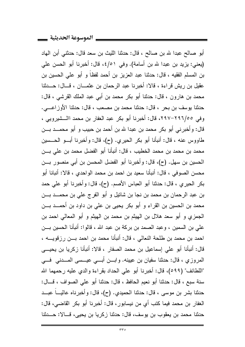 أبو صالح عبد الله بن صالح، قال: حدثنا الليث بن سعد قال: حدنتي ابن الهاد (يعني: يزيد بن عبد الله بن أسامة). وفي ٥١/ ٤، قال: أخبرنا أبو الحسن علي بن المسلم الفقيه، قال: حدثنا عبد العزيز بن أحمد لفظًا وأبو علي الحسين بن عقيل بن ريش قراءة، قالا: أخبرنا عبد الرحمان بن عثمان، قال: حدثنا محمد بن هارون، قال: حدثنا أبو بكر محمد بن أبي عبد الملك القرشي، قال: حدثنا يوسف بن بحر، قال: حدثنا محمد بن مصعب، قال: حدثنا الأوزاعي. وفي ٥٥/ ٢٩٦ - ٢٩٧، قال: أخبرنا أبو بكر عبد الغفار بن محمد الشيرويي، قال: وأخبرني أبو بكر محمد بن عبد الله بن أحمد بن حبيب وأبو محمد بن طاووس عنه، قال: أنبأنا أبو بكر الحيري. (ح)، قال: وأخبرنا أبو الحسين محمد بن محمد بن محمد الخطيب، قال: أنبأنا أبو الفضل محمد بن علي بن الحسين بن سهل. (ح)، قال: وأخبرنا أبو الفضل المحسن بن أبي منصور بن محسن الصوفي، قال: أنبأنا سعيد بن أحمد بن محمد الواحدي، قالا: أنبأنا أبو بكر الحيري، قال: حدثنا أبو العباس الأصم. (ح)، قال: وأخبرنا أبو علي حمد بن عبد الرحمان بن محمد بن نجا بن شاتيل وأبو الفرج علي بن محمد بن محمد بن الحسين بن القراء وأبو بكر يحيى بن علي بن داود بن أحمد بن الجمزي وأبو سعد هلال بن الهيثم بن محمد بن الهيثم وأبو المعالي أحمد بن علي بن السمين، وعبد الصمد بن بركة بن عبد الله، قالوا: أنبأنا الحسين بن أحمد بن محمد بن طلحة النعالي، قال: أنبأنا محمد بن أحمد بن رزقويه، قال: أنبأنا أبو علي إسماعيل بن محمد الصفار، قالا: أنبأنا زكريا بن يحيى المروزي، قال: حدثنا سفيان بن عيينه. وابن أبي عيسى المدني في "اللطائف" (٥٩٩)، قال: أخبرنا أبو علي الحداد بقراءة والدي عليه رحمهما الله سنة سبع، قال: حدثنا أبو نعيم الحافظ، قال: حدثنا أبو علي الصواف، قال: حدثنا بشر بن موسى، قال: حدثنا الحميدي. (ح)، قال: وأخبرناه عاليًا عبد الغفار بن محمد فيما كتب أي من نيسابور، قال: أخبرنا أبو بكر القاضي، قال: حدثنا محمد بن يعقوب بن يوسف، قال: حدثنا زكريا بن يحيى، قالا: حدثنا