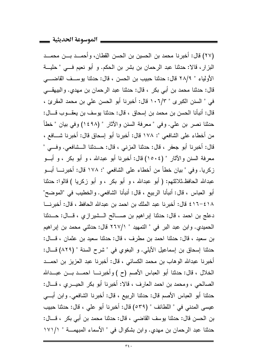 (٢٧) قال: أخبرنا محمد بن الحسين بن الحسن القطان، وأحمد بن محمد البزار، قالا: حدثنا عبد الرحمان بن بشر بن الحكم. وأبو نعيم في "حلية الأولياء" ٩/ ٢٨ قال: حدثنا حبيب بن الحسن، قال: حدثنا يوسف القاضي قال: حدثنا محمد بن أبي بكر، قال: حدثنا عبد الرحمان بن مهدي. والبيهقي في "السنن الكبرى" ٣/ ١٠٦ قال: أخبرنا أبو الحسن علي بن محمد المقرئ، قال: أنبأنا الحسن بن محمد بن إسحاق، قال: حدثنا يوسف بن يعقوب قال: حدثنا نصر بن علي. وفي "معرفة السنن والآثار" (١٤٩٨) وفي بيان "خطأ من أخطاء على الشافعي": ١٧٨ قال: أخبرنا أبو إسحاق قال: أخبرنا شافع، قال: أخبرنا أبو جعفر، قال: حدثنا المزني، قال: حدثنا الشافعي. وفي "مرفة السنن والآثار" (١٥٠٤) قال: أخبرنا أبو عبد الله، وأبو بكر، وأبو زكريا. وفي "بيان خطأ من أخطاء على الشافعي": ١٧٨ قال: أخبرنا أبو عبد الله الحافظ. ثلاثتهم: (أبو عبد الله، وأبو بكر، وأبو زكريا) قالوا: حدثنا أبو العباس، قال: أنبأنا الربيع، قال: أنبأنا الشافعي. والخطيب في "الموضح" ٤١٨ - ٤١٦ قال: أخبرنا عبد الملك بن أحمد بن عبد اللّه الحافظ، قال: أخبرنا دعلج بن أحمد، قال: حدثنا إبراهيم بن صالح الشيرازي، قال: حدثنا الحميدي. وابن عبد البر في "التمهيد" ١/ ٢٦٧ قال: حدثني محمد بن إبراهيم بن سعيد، قال: حدثنا أحمد بن مطرف، قال: حدثنا سعيد بن عثمان، قال: حدثنا إسحاق بن إسماعيل الآيلي. والبغوي في "شرح السنة" (٨٢٩) قال: أخبرنا عبد الله الوهاب بن محمد الكسائي، قال: أخبرنا عبد العزيز بن أحمد الخلال، قال: حدثنا أبو العباس الأصم (ح) وأخبرنا أحمد بن عبد الله الصالحي، ومحمد بن أحمد العارف، قالا: أخبرنا أبو بكر الحيري، قال: حدثنا أبو العباس الأصم قال: حدثنا الربيع، قال: أخبرنا الشافعي. وابن أبي عيسى المدني في "اللطائف" (٥٣٩) قال: أخبرنا أبو علي، قال: حدثنا حبيب بن الحسن قال: حدثنا يوسف القاضي، قال: حدثنا محمد بن أبي بكر، قال: حدثنا عبد الرحمان بن مهدي. وابن بشوال في "الأسماء المبهمة" ١/ ١٧١