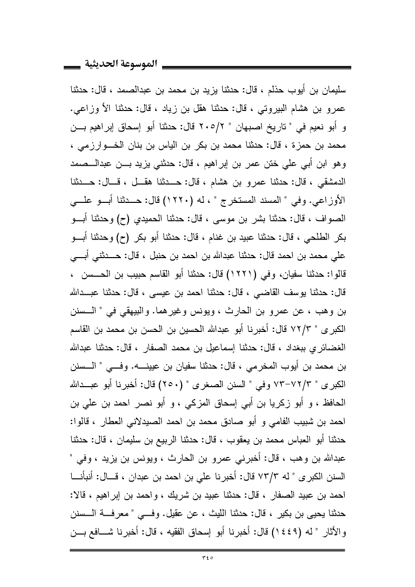 سليمان بن أيوب حذلم، قال: حدثنا يزيد بن محمد بن عبد الصمد، قال: حدثنا عمرو بن هشام البيروتي، قال: حدثنا هقل بن زياد، قال: حدثنا الأوزاعي. وأبو نعيم في "تاريخ أصبهان" ٢/ ٢٠٥ قال: حدثنا أبو إسحاق إبراهيم بن محمد بن حمزة، قال: حدثنا محمد بن بكر بن الياس بن بنان الخوارزمي، وهو ابن أبي علي ختن عمر بن إبراهيم، قال: حدثني يزيد بن عبد الصمد الدمشقي، قال: حدثنا عمرو بن هشام، قال: حدثنا هقل، قال: حدثنا الأوزاعي. وفي "المسند المستخرج"، له (١٢٢٠) قال: حدثنا أبو علي الصواف، قال: حدثنا بشر بن موسى، قال: حدثنا الحميدي (ح) وحدثنا أبو بكر الطلحي، قال: حدثنا عبيد بن غنام، قال: حدثنا أبو بكر (ح) وحدثنا أبو علي محمد بن أحمد قال: حدثنا عبد الله بن أحمد بن حنبل، قال: حدثني أبي قالوا: حدثنا سفيان، وفي (١٢٢١) قال: حدثنا أبو القاسم حبيب بن الحسن، قال: حدثنا يوسف القاضي، قال: حدثنا أحمد بن عيسى، قال: حدثنا عبد الله بن وهب، عن عمرو بن الحارث، ويونس وغيرهما. والبيهقي في "السنن الكبرى" ٣/ ٧٢ قال: أخبرنا أبو عبد الله الحسين بن الحسن بن محمد بن القاسم الغضائري ببغداد، قال: حدثنا إسماعيل بن محمد الصفار، قال: حدثنا عبد الله بن محمد بن أيوب المخرمي، قال: حدثنا سفيان بن عيينه. وفي "السنن الكبرى" ٣/ ٧٢ - ٧٣ وفي "السنن الصغرى" (٢٥٠) قال: أخبرنا أبو عبد الله الحافظ، وأبو زكريا بن أبي إسحاق المزكي، وأبو نصر أحمد بن علي بن أحمد بن شبيب الفامي وأبو صادق محمد بن أحمد الصيدلاني العطار، قالوا: حدثنا أبو العباس محمد بن يعقوب، قال: حدثنا الربيع بن سليمان، قال: حدثنا عبد الله بن وهب، قال: أخبرني عمرو بن الحارث، ويونس بن يزيد، وفي "السنن الكبرى" له ٣/ ٧٣ قال: أخبرنا علي بن أحمد بن عبدان، قال: أنبأنا أحمد بن عبيد الصفار، قال: حدثنا عبيد بن شريك، وأحمد بن إبراهيم، قالا: حدثنا يحيى بن بكير، قال: حدثنا الليث، عن عقيل. وفي "معرفة السنن والآثار" له (١٤٤٩) قال: أخبرنا أبو إسحاق الفقيه، قال: أخبرنا شافع بن