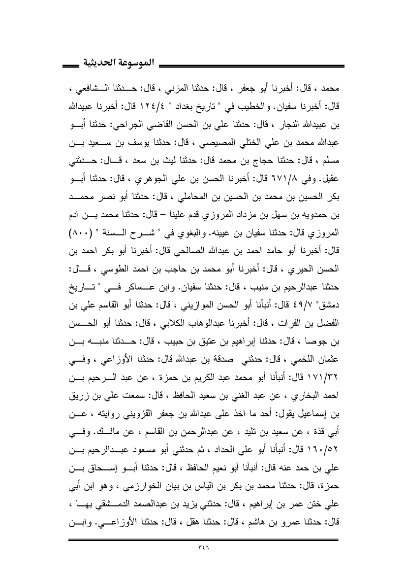 محمد، قال: أخبرنا أبو جعفر، قال: حدثنا المزني، قال: حدثنا الشافعي، قال: أخبرنا سفيان. والخطيب في "تاريخ بغداد" ٤/ ١٢٤ قال: أخبرنا عبيد الله بن عبيد الله النجار، قال: حدثنا علي بن الحسن القاضي الجراحي: حدثنا أبو عبد الله محمد بن علي الختلي المصيصي، قال: حدثنا يوسف بن سعيد بن مسلم، قال: حدثنا حجاج بن محمد قال: حدثنا ليث بن سعد، قال: حدثني عقيل. وفي ٨/ ٦٧١ قال: أخبرنا الحسن بن علي الجوهري، قال: حدثنا أبو بكر الحسين بن محمد بن الحسين بن المحاملي، قال: حدثنا أبو نصر محمد بن حمدويه بن سهل بن مزداد المروزي قدم علينا - قال: حدثنا محمد بن آدم المروزي قال: حدثنا سفيان بن عيينه. والبغوي في "شرح السنة" (٨٠٠) قال: أخبرنا أبو حامد أحمد بن عبد الله الصالحي قال: أخبرنا أبو بكر أحمد بن الحسن الحيري، قال: أخبرنا أبو محمد بن حاجب بن أحمد الطوسي، قال: حدثنا عبد الرحيم بن منيب، قال: حدثنا سفيان. وابن عساكر في "تاريخ دمشق" ٧/ ٤٩ قال: أنبأنا أبو الحسن الموازيني، قال: حدثنا أبو القاسم علي بن الفضل بن الفرات، قال: أخبرنا عبد الوهاب الكلابي، قال: حدثنا أبو الحسن بن جوصا، قال: حدثنا إبراهيم بن عتيق بن حبيب، قال: حدثنا منبه بن عثمان اللخمي، قال: حدثني صدقة بن عبد الله قال: حدثنا الأوزاعي، وفي ٣٢/ ١٧١ قال: أنبأنا أبو محمد عبد الكريم بن حمزة، عن عبد الرحيم بن أحمد البخاري، عن عبد الغني بن سعيد الحافظ، قال: سمعت علي بن زريق بن إسماعيل يقول: أحد ما أخذ على عبد الله بن جعفر القزويني روايته، عن أبي قذة، عن سعيد بن تليد، عن عبد الرحمن بن القاسم، عن مالك. وفي ٥٢/ ١٦٠ قال: أنبأنا أبو علي الحداد، ثم حدثني أبو مسعود عبد الرحيم بن علي بن حمد عنه قال: أنبأنا أبو نعيم الحافظ، قال: حدثنا أبو إسحاق بن حمزة، قال: حدثنا محمد بن بكر بن الياس بن بيان الخوارزمي، وهو ابن أبي علي ختن عمر بن إبراهيم، قال: حدثني يزيد بن عبد الصمد الدمشقي بها، قال: حدثنا عمرو بن هاشم، قال: حدثنا هقل، قال: حدثنا الأوزاعي. وابن