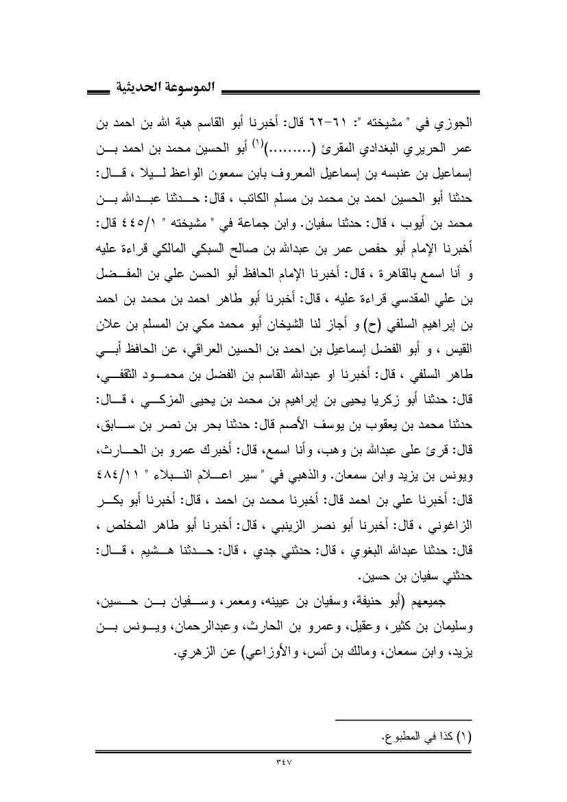 الجوزي في "مشيخته": ٦١ - ٦٢ قال: أخبرنا أبو القاسم هبة الله بن أحمد بن عمر الحريري البغدادي المقرئ ( ............ ) (¬١) أبو الحسين محمد بن أحمد بن إسماعيل بن عنبسه بن إسماعيل المعروف بابن سمعون الواعظ ليلا، قال: حدثنا أبو الحسين أحمد بن محمد بن مسلم الكاتب، قال: حدثنا عبد الله بن محمد بن أيوب، قال: حدثنا سفيان. وابن جماعة في "مشيخته" ١/ ٤٤٥ قال: أخبرنا الإمام أبو حفص عمر بن عبد الله بن صالح السبكي المالكي قراءة عليه وأنا اسمع بالقاهرة، قال: أخبرنا الإمام الحافظ أبو الحسن علي بن المفضل بن علي المقدسي قراءة عليه، قال: أخبرنا أبو طاهر أحمد بن محمد بن أحمد بن إبراهيم السلفي (ح) و أجاز لنا الشيخان أبو محمد مكي بن المسلم بن علان القيس، وأبو الفضل إسماعيل بن أحمد بن الحسين العراقي، عن الحافظ أبي طاهر السلفي، قال: أخبرنا أبو عبد الله القاسم بن الفضل بن محمود الثقفي، قال: حدثنا أبو زكريا يحيى بن إبراهيم بن محمد بن يحيى المزكي، قال: حدثنا محمد بن يعقوب بن يوسف الأصم قال: حدثنا بحر بن نصر بن سابق، قال: قرئ على عبد الله بن وهب، وأنا أسمع، قال: أخبرك عمرو بن الحارث، ويونس بن يزيد وابن سمعان. والذهبي في "سير أعلام النبلاء" ١١/ ٤٨٤ قال: أخبرنا علي بن أحمد قال: أخبرنا محمد بن أحمد، قال: أخبرنا أبو بكر الزاغوني، قال: أخبرنا أبو نصر الزينبي، قال: أخبرنا أبو طاهر المخلص، قال: حدثنا عبد الله البغوي، قال: حدثني جدي، قال: حدثنا هشيم، قال: حدثني سفيان بن حسين.