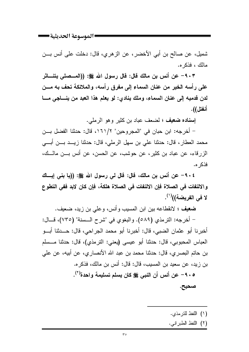 ٩٠٣ - عن أنس بن مالك قال: قال رسول اللَّه -صلى اللَّه عليه وسلم-: "المصلي يتناثر على رأسه الخير من عنان السماء إلى مفرق رأسه، والملائكة تحف به من لدن قدميه إلى عنان السماء، وملك ينادي: لو يعلم هذا العبد من يناجي ما أنفتل".