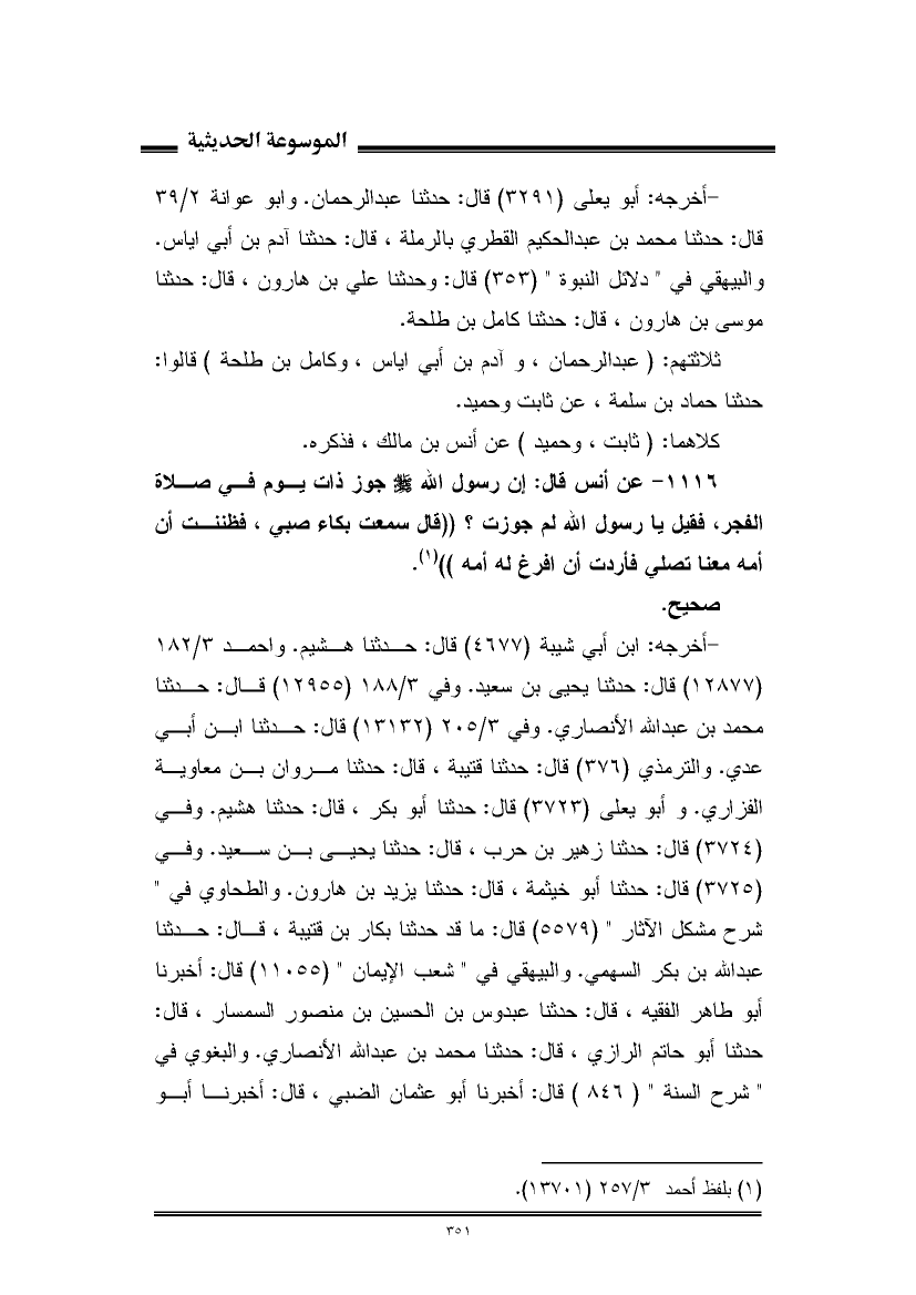 ١١١٦ - عن أنس قال: إن رسول الله - صلى الله عليه وسلم - جوز ذات يوم في صلاة الفجر، فقيل يا رسول الله لم جوزت؟ "قال سمعت بكاء صبي، فظننت أن أمه معنا تصلي فأردت أن أفرغ له أمه" (¬١).