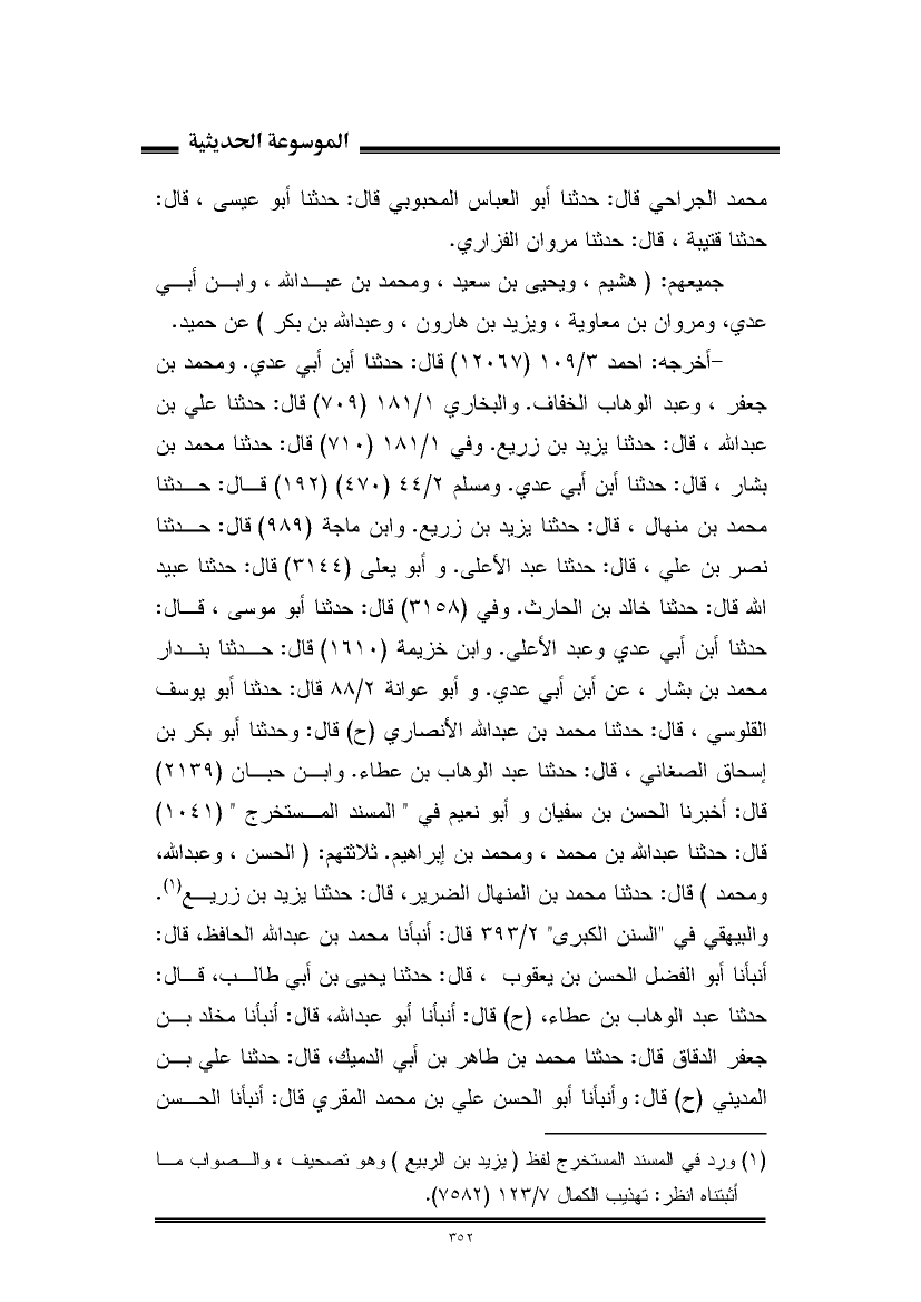 محمد الجراحي قال: حدثنا أبو العباس المحبوبي قال: حدثنا أبو عيسى، قال: حدثنا قتيبة، قال: حدثنا مروان الفزاري.