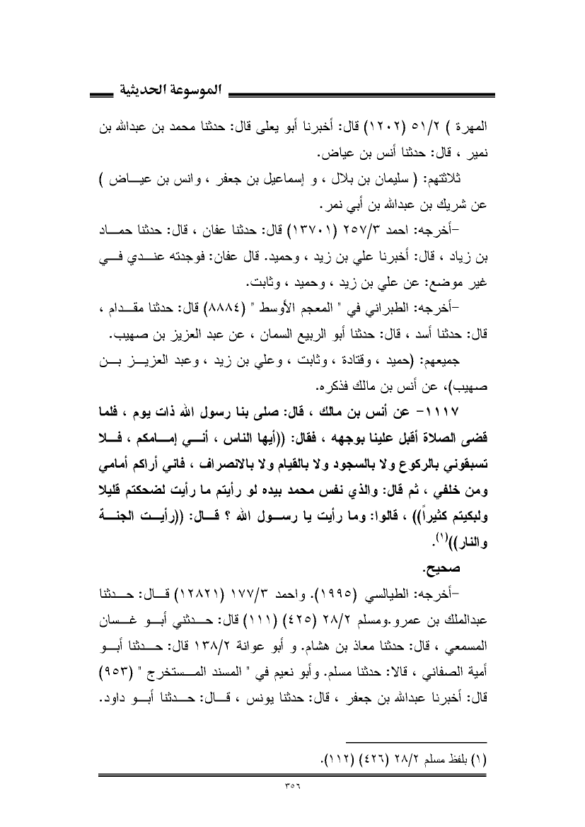 ١١١٧ - عن أنس بن مالك، قال: صلى بنا رسول الله ذات يوم، فلما قضى الصلاة أقبل علينا بوجهه، فقال: "أيها الناس، أني إمامكم، فلا تسبقوني بالركوع ولا بالسجود ولا بالقيام ولا بالانصراف، فإني أراكم أمامي ومن خلفي، ثم قال: والذي نفس محمد بيده لو رأيتم ما رأيت لضحكتم قليلا ولبكيتم كثيرًا"، قالوا: وما رأيت يا رسول الله؟ قال: "رأيت الجنة والنار" (¬١).