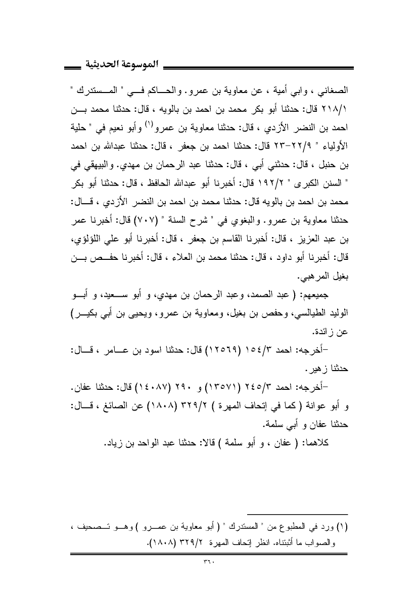 الصغاني، وأبي أمية، عن معاوية بن عمرو. والحاكم في "المستدرك" ١/ ٢١٨ قال: حدثنا أبو بكر محمد بن أحمد بن بالويه، قال: حدثنا محمد بن أحمد بن النضر الأزدي، قال: حدثنا معاوية بن عمرو (¬١) وأبو نعيم في "حلية الأولياء" ٩/ ٢٢ - ٢٣ قال: حدثنا أحمد بن جعفر، قال: حدثنا عبد الله بن أحمد بن حنبل، قال: حدثني أبي، قال: حدثنا عبد الرحمان بن مهدي. والبيهقي في "السنن الكبرى" ٢/ ١٩٢ قال: أخبرنا أبو عبد الله الحافظ، قال: حدثنا أبو بكر محمد بن أحمد بن بالويه قال: حدثنا محمد بن أحمد بن النضر الأزدي، قال: حدثنا معاوية بن عمرو. والبغوي في "شرح السنة" (٧٠٧) قال: أخبرنا عمر بن عبد العزيز، قال: أخبرنا القاسم بن جعفر، قال: أخبرنا أبو علي اللؤلؤي، قال: أخبرنا أبو داود، قال: حدثنا محمد بن العلاء، قال: أخبرنا حفص بن بغيل المرهبي.