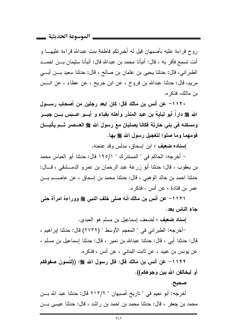 ١١٢٠ - عن أنس بن مالك قال: كان أبعد رجلين من أصحاب رسول الله - صلى الله عليه وسلم - دارًا أبو لبابة بن عبد المنذر وأهله بقباء وأبو عبس بن جبر ومسكنه في بني حارثة فكانا يصليان مع رسول الله - صلى الله عليه وسلم - العصر ثم يأتيان قومهما وما صلوا لتعجيل رسول الله - صلى الله عليه وسلم - بها.