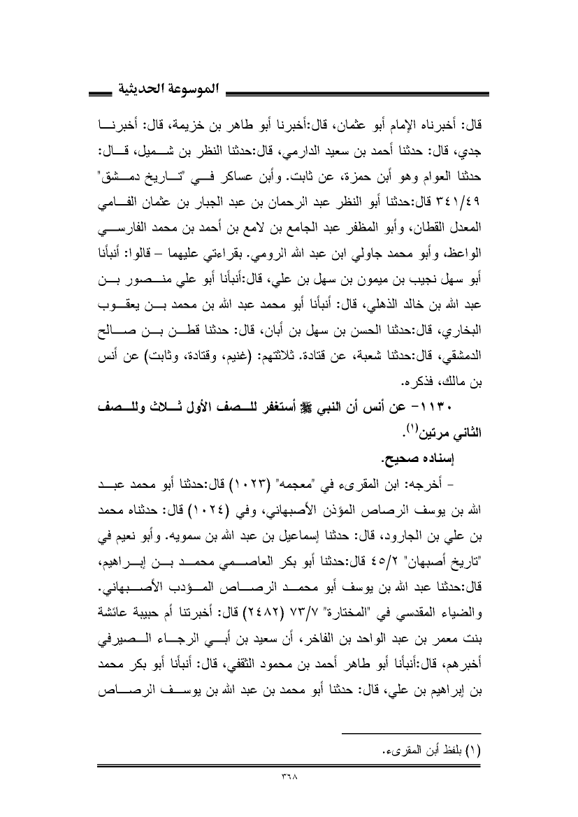 ١١٣٠ - عن أنس أن النبي - صلى الله عليه وسلم - أستغفر للصف الأول ثلاث وللصف الثاني مرتين (¬١).
