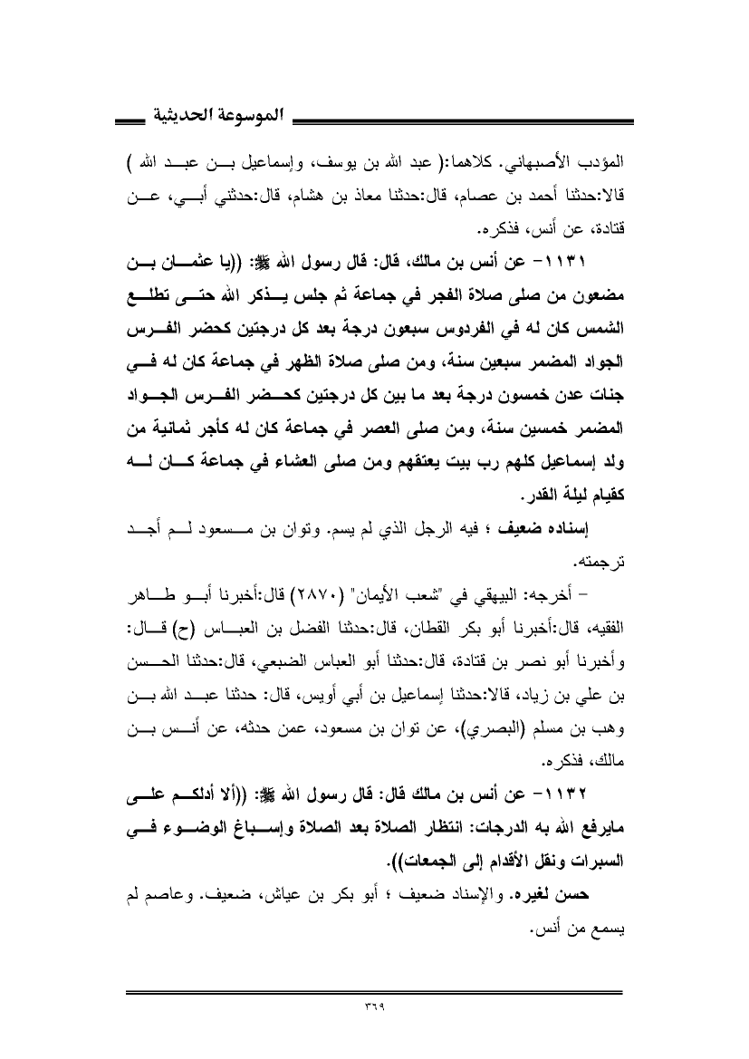 ١١٣١ - عن أنس بن مالك، قال: قال رسول الله - صلى الله عليه وسلم -: "يا عثمان بن مظعون من صلى صلاة الفجر في جماعة ثم جلس يذكر الله حتى تطلع الشمس كان له في الفردوس سبعون درجة بعد كل درجتين كحضر الفرس الجواد المضمر سبعين سنة، ومن صلى صلاة الظهر في جماعة كان له في جنات عدن خمسون درجة بعد ما بين كل درجتين كحضر الفرس الجواد المضمر خمسين سنة، ومن صلى العصر في جماعة كان له كأجر ثمانية من ولد إسماعيل كلهم رب بيت يعتقهم ومن صلى العشاء في جماعة كان له كفيام ليلة القدر.