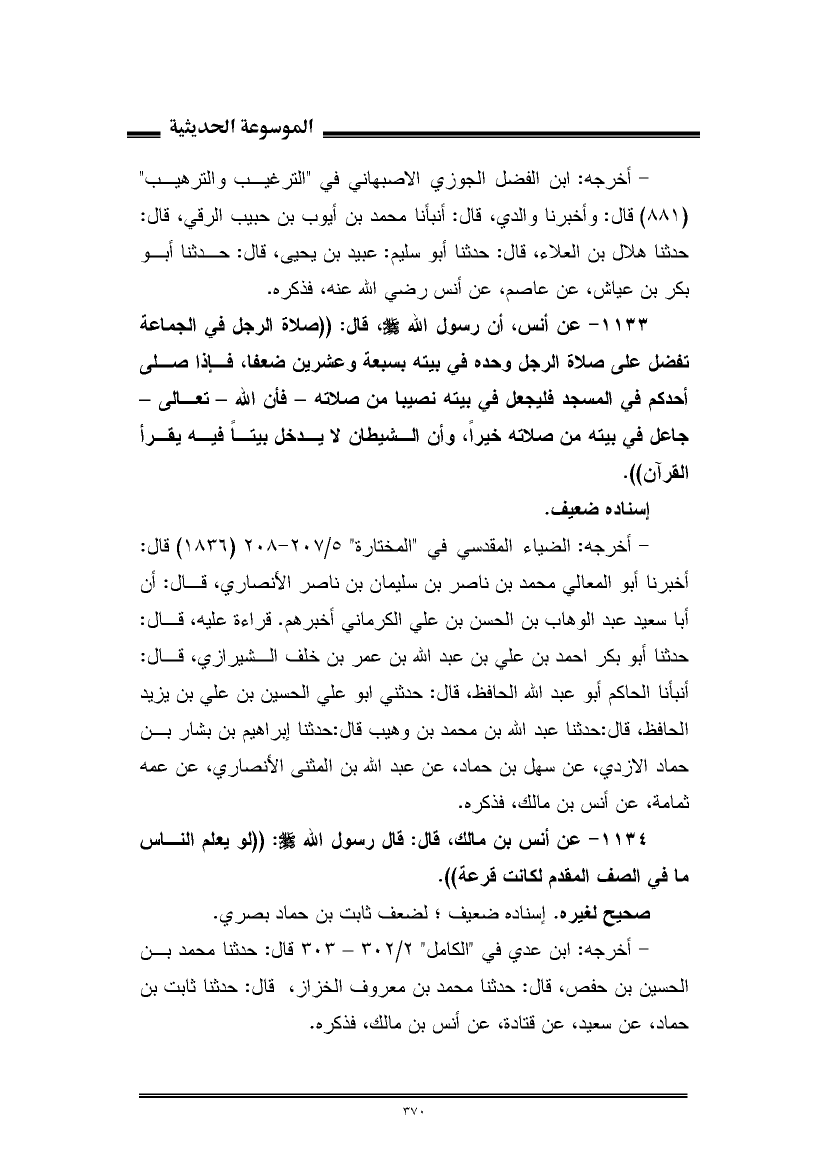 ١١٣٤ - عن أنس بن مالك، قال: قال رسول الله - صلى الله عليه وسلم -: "لو يعلم الناس ما في الصف المقدم لكانت قرعة".