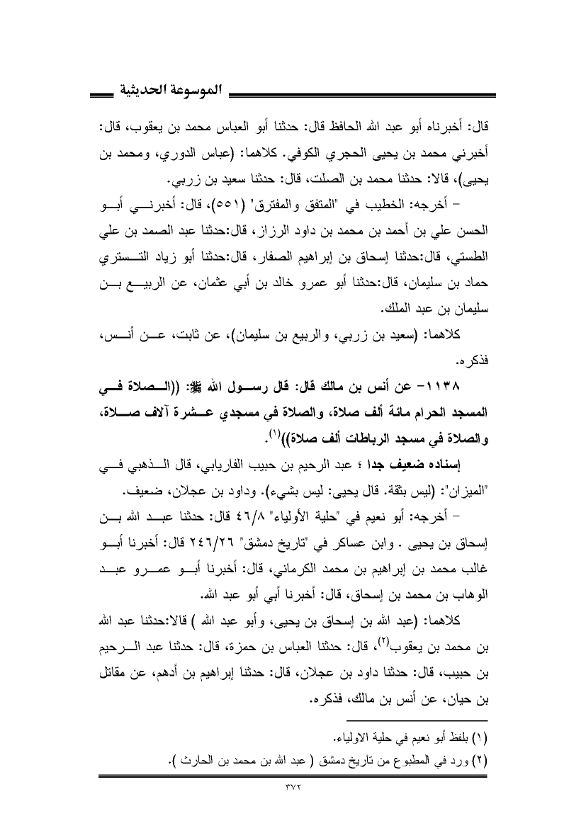 ١١٣٨ - عن أنس بن مالك قال: قال رسول الله - صلى الله عليه وسلم -: "الصلاة في المسجد الحرام مائة ألف صلاة، والصلاة في مسجدي عشرة آلاف صلاة، والصلاة في مسجد الرباطات ألف صلاة" (¬١).
