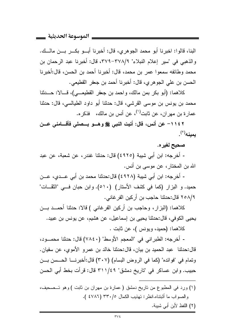 كلاهما: (أبو بكر بمن مالك، وأحمد بن جعفر القطيعي)، قالا: حدثنا محمد بن يونس بن موسى القرشي، قال: حدثنا أبو داود الطيالسي، قال: حدثنا عمارة بن مهران، عن ثابت (¬١)، عن أنس بن مالك، فذكره.