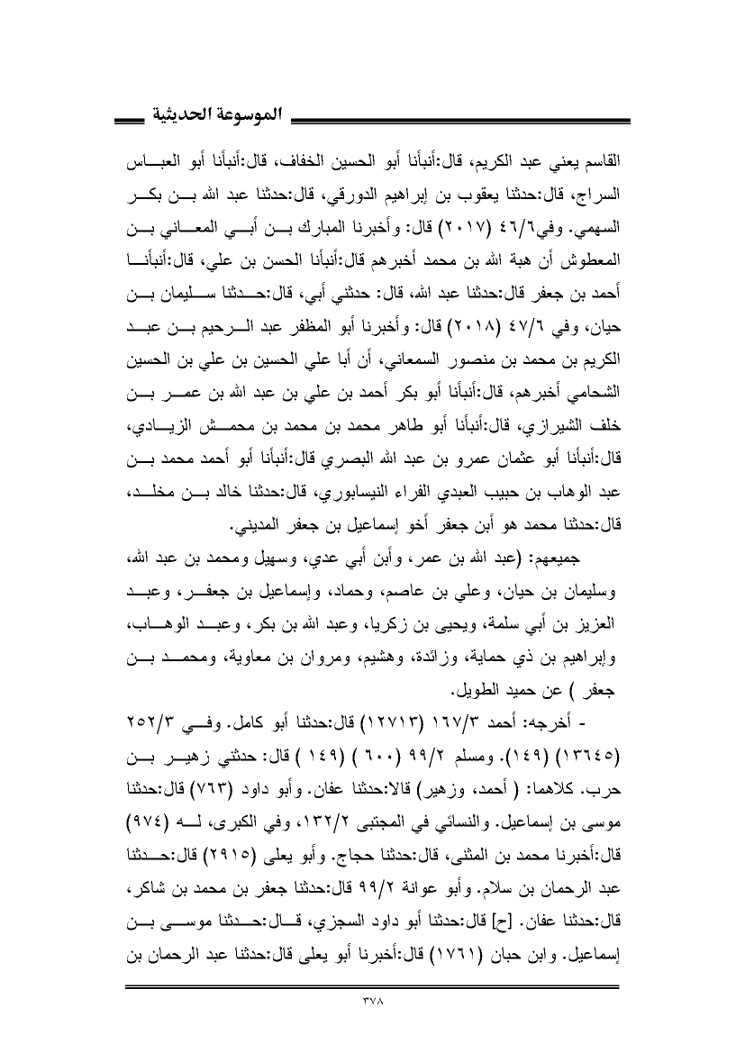 القاسم يعني عبد الكريم، قال: أنبأنا أبو الحسين الخفاف، قال: أنبأنا أبو العباس السراج، قال: حدثنا يعقوب بن إبراهيم الدورقي، قال: حدثنا عبد الله بن بكر السهمي. وفي ٦/ ٤٦ (٢٠١٧) قال: وأخبرنا المبارك بن أبي المعاني بن المعطوش أن هبة الله بن محمد أخبرهم قال: أنبأنا الحسن بن علي، قال: أنبأنا أحمد بن جعفر قال: حدثنا عبد الله، قال: حدثني أبي، قال: حدثنا سليمان بن حيان، وفي ٦/ ٤٧ (٢٠١٨) قال: وأخبرنا أبو المظفر عبد الرحيم بن عبد الكريم بن محمد بن منصور السمعاني، أن أبا علي الحسين بن علي بن الحسين الشحامي أخبرهم، قال: أنبأنا أبو بكر أحمد بن علي بن عبد الله بن عمر بن خلف الشيرازي، قال: أنبأنا أبو طاهر محمد بن محمد بن محمش الزيادي، قال: أنبأنا أبو عثمان عمرو بن عبد الله البصري قال: أنبأنا أبو أحمد محمد بن عبد الوهاب بن حبيب العبدي الفراء النيسابوري، قال: حدثنا خالد بن مخلد، قال: حدثنا محمد هو ابن جعفر أخو إسماعيل بن جعفر المديني.