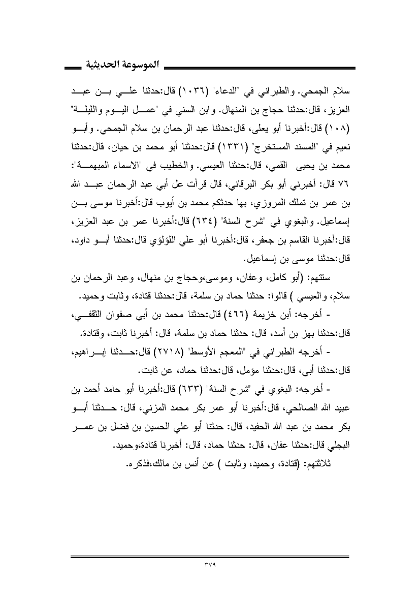 ستتهم: (أبو كامل، وعفان، وموسى، وحجاج بن منهال، وعبد الرحمان بن سلام، والعيسي) قالوا: حدثنا حماد بن سلمة، قال: حدثنا قتادة، وثابت وحميد.