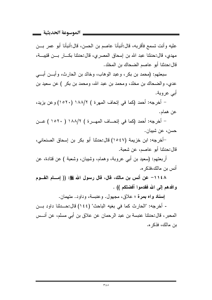 - أخرجه: "الحارث كما في بغيه الباحث" (١٤٤) قال: حدثنا داود بن المحبر، قال: حدثنا عنبسة بن عبد الرحمان عن علاق بن أبي مسلم، عن أنس بن مالك، فذكره.