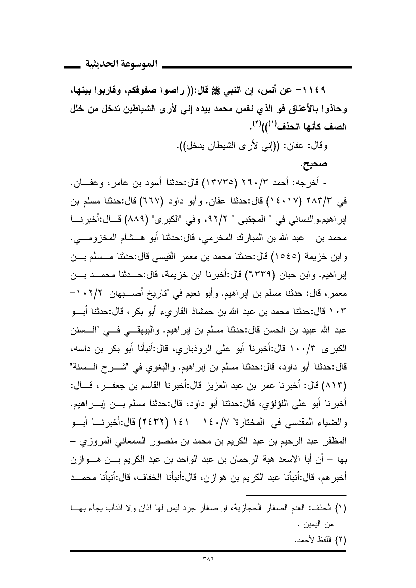 ١١٤٩ - عن أنس، إن النبي - صلى الله عليه وسلم - قال: "راصوا صفوفكم، وقاربوا بينها، وحاذوا بالأعناق فوالذي نفس محمد بيده إني لأرى الشياطين تدخل من خلل الصف كأنها الحذف (¬١) " (¬٢).