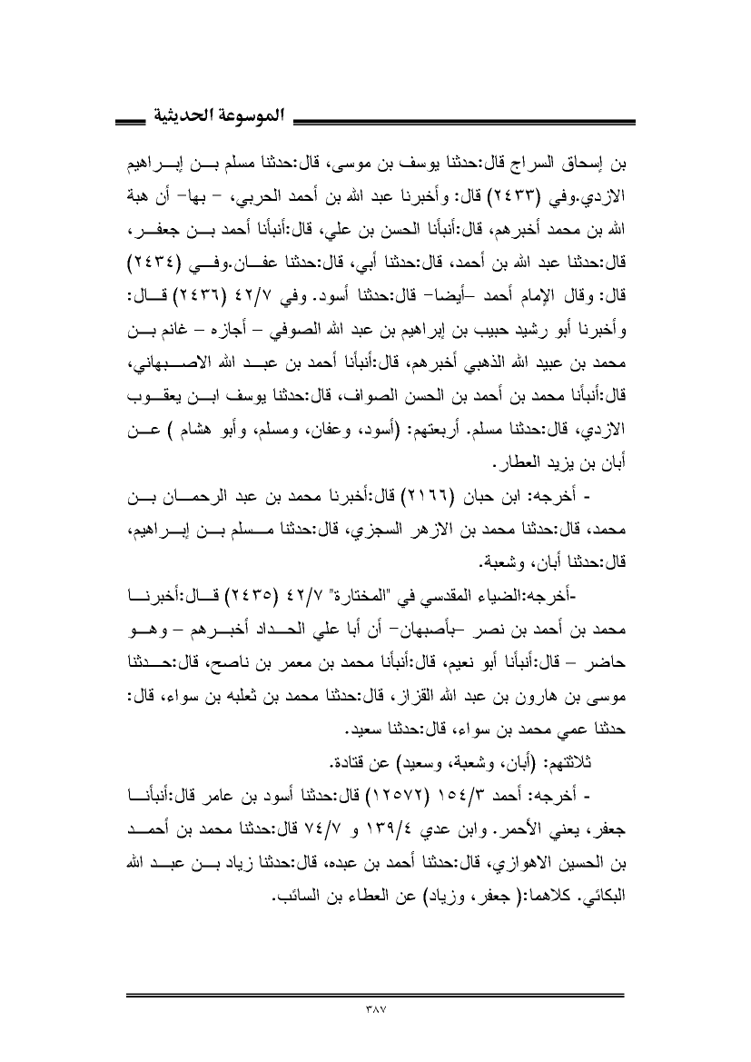 بن إسحاق السراج قال: حدثنا يوسف بن موسى، قال: حدثنا مسلم بن إبراهيم الأزدي. وفي (٢٤٣٣) قال: وأخبرنا عبد الله بن أحمد الحربي، - بها - أن هبة الله بن محمد أخبرهم، قال: أنبأنا الحسن بن علي، قال: أنبأنا أحمد بن جعفر، قال: حدثنا عبد الله بن أحمد، قال: حدثنا أبي، قال: حدثنا عفان. وفي (٢٤٣٤) قال: وقال الإمام أحمد - أيضا - قال: حدثنا أسود. وفي ٧/ ٤٢ (٢٤٣٦) قال: وأخبرنا أبو رشيد حبيب بن إبراهيم بن عبد الله الصوفي - أجازه - غانم بن محمد بن عبيد الله الذهبي أخبرهم، قال: أنبأنا أحمد بن عبد الله الأصبهاني، قال: أنبأنا محمد بن أحمد بن الحسن الصواف، قال: حدثنا يوسف بن يعقوب الأزدي، قال: حدثنا مسلم. أربعتهم: (أسود، و عفان، ومسلم، وأبو هشام) عن أبان بن يزيد العطار.