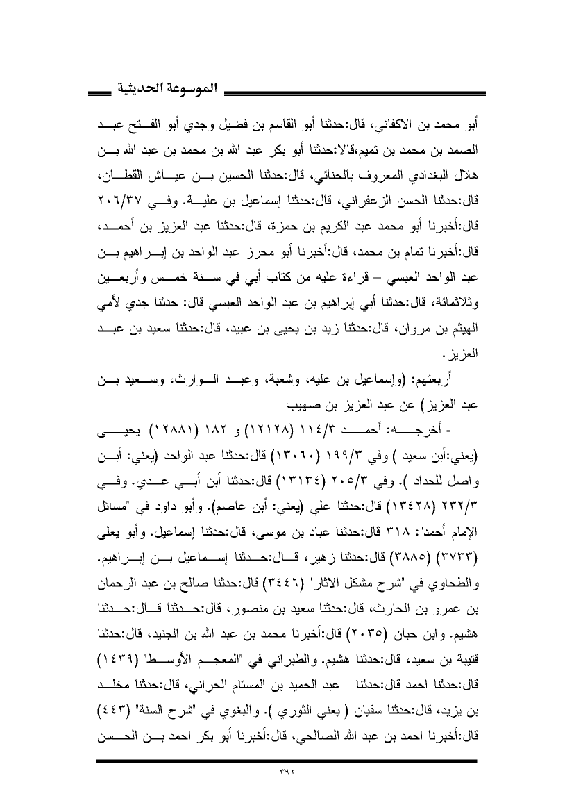 أبو محمد بن الأكفاني، قال: حدثنا أبو القاسم بن فضيل وجدي أبو الفتح عبد الصمد بن محمد بن تميم، قالا: حدثنا أبو بكر عبد الله بن محمد بن عبد الله بن هلال البغدادي المعروف بالحنائي، قال: حدثنا الحسين بن عياش القطان، قال: حدثنا الحسن الزعفراني، قال: حدثنا إسماعيل بن علية. وفي ٣٧/ ٢٠٦ قال: أخبرنا أبو محمد عبد الكريم بن حمزة، قال: حدثنا عبد العزيز بن أحمد، قال: أخبرنا تمام بن محمد، قال: أخبرنا أبو محرز عبد الواحد بن إبراهيم بن عبد الواحد العبسي - قراءة عليه من كتاب أبي في سنة خمس وأربعين وثلاثمائة، قال: حدثنا أبي إبراهيم بن عبد الواحد العبسي قال: حدثنا جدي لأمي الهيثم بن مروان، قال: حدثنا زيد بن يحيى بن عبيد، قال: حدثنا سعيد بن عبد العزيز.