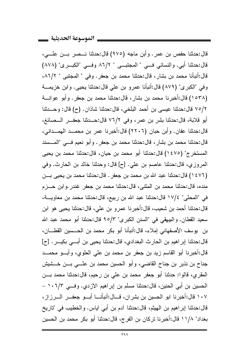 قال: حدثنا حفص بن عمر. وابن ماجه (٩٧٥) قال: حدثنا نصر بن علي، قال: حدثنا أبي. والنسائي في "المجتبى" ٢/ ٨٦ وفي "الكبرى" (٨٧٨) قال: أنبأنا محمد بن بشار، قال: حدثنا محمد بن جعفر. وفي "المجتبى" ٢/ ٨٦، وفي "الكبرى" (٨٧٩) قال: أنبأنا عمرو بن علي قال: حدثنا يحيى. وابن خزيمة (١٥٣٨) قال: أخبرنا محمد بن بشار، قال: حدثنا محمد بن جعفر. وأبو عوانة ٢/ ٧٥ قال: حدثنا عيسى بن أحمد البلخي، قال: حدثنا شاذان. (ح) قال: وحدثنا أبو قلابة، قال: حدثنا بشر بن عمر، وفي ٢/ ٧٦ قال: حدثنا جعفر الصائغ، قال: حدثنا عفان. وابن حبان (٢٢٠٦) قال: أخبرنا عمر بن محمد الهمداني، قال: حدثنا محمد بن بشار، قال: حدثنا محمد بن جعفر. وأبو نعيم في "المسند المستخرج" (١٤٧٥) قال: حدثنا أبو محمد بن حيان، قال: حدثنا محمد بن يحيى المروزي، قال: حدثنا عاصم بن علي. [ح] قال: وحدثنا خالد بن الحارث. وفي (١٤٧٦) قال: حدثنا عبد الله بن محمد بن جعفر. قال: حدثنا محمد بن يحيى بن منده، قال: حدثنا محمد بن المثنى، قال: حدثنا محمد بن جعفر غندر. وابن حزم في "المحلى" ١٧/ ٤ قال: حدثنا عبد الله بن ربيع، قال: حدثنا محمد بن معاوية، قال: حدثنا أحمد بن شعيب، قال: أخبرنا عمرو بن علي، قال: حدثنا يحيى هو ابن سعيد القطان. والبيهقي في "السنن الكبرى" ٣/ ٩٥ قال: حدثنا أبو محمد عبد الله بن يوسف الأصفهاني إملاء، قال: أنبأنا أبو بكر محمد بن الحسين القطان، قال: حدثنا إبراهيم بن الحارث البغدادي، قال: حدثنا يحيى بن أبي بكير. [ح] قال: أخبرنا أبو القاسم زيد بن جعفر بن محمد بن علي العلوي، وأبو محمد جناح بن نذير بن جناح القاضي، وأبو الحسين محمد بن علي بن خشيش المقري، قالوا: حدثنا أبو جعفر محمد بن علي بن رحيم، قال: حدثنا محمد بن الحسين بن أبي الحنين، قال: حدثنا مسلم بن إبراهيم الأزدي. وفي ٣/ ١٠٦ - ١٠٧ قال: أخبرنا أبو الحسين بن بشران، قال: أنبأنا أبو جعفر الرزاز، قال: حدثنا إبراهيم بن الهيثم، قال: حدثنا آدم بن أبي اياس. والخطيب في "تاريخ بغداد" ٨/ ١١ قال: أخبرنا تركان بن الفرج، قال: حدثنا أبو بكر محمد بن الحسين