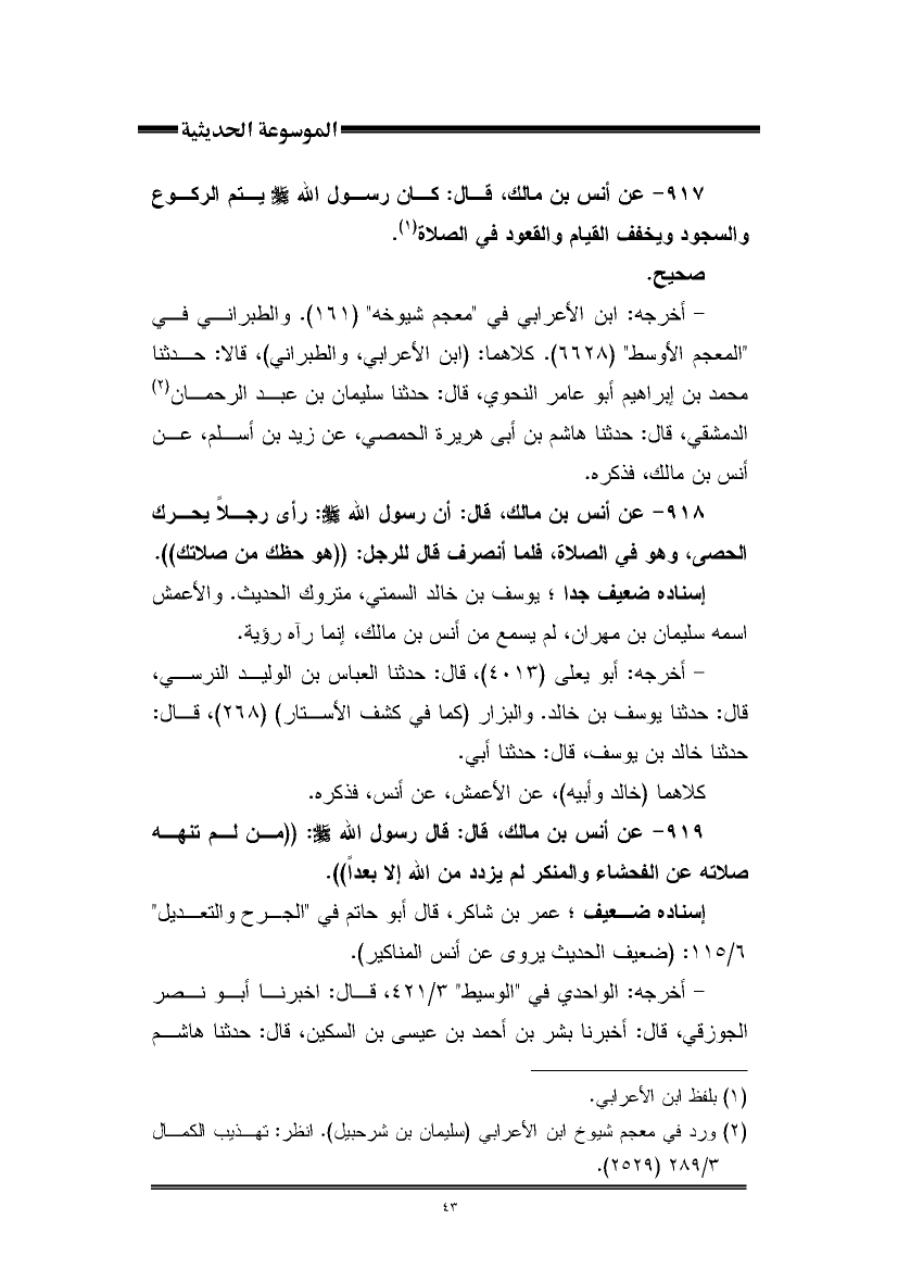 ٩١٧ - عن أنس بن مالك، قال: كان رسول اللَّه -صلى اللَّه عليه وسلم- يتم الركوع والسجود ويخفف القيام والقعود في الصلاة (¬١).