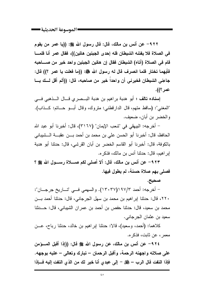 ٩٢٤ - عن أنس بن مالك، عن رسول اللَّه -صلى اللَّه عليه وسلم- قال: "إذا أقبل المؤمن على صلاته واجهته الرحمة، وأقبل الرحمان -تبارك وتعالى- عليه بوجهه. فإذا التفت قال الرب -عَزَّ وَجَلَّ- إلى عبدي أنا خير لك من الذي التفت إليه فإذا