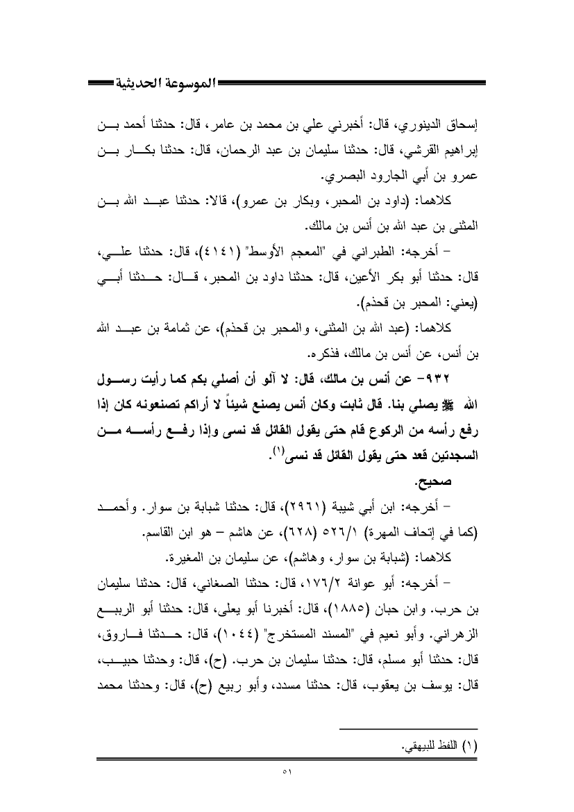 ٩٣٢ - عن أنس بن مالك، قال: لا آلو أن أصلي بكم كما رأيت رسول اللَّه -صلى اللَّه عليه وسلم- يصلي بنا. قال ثابت وكان أنس يصنع شيئًا لا أراكم تصنعونه كان إذا رفع رأسه من الركوع قام حتى يقول القائل قد نسى وإذا رفع رأسه من السجدتين قعد حتى يقول القائل قد نسى (¬١).