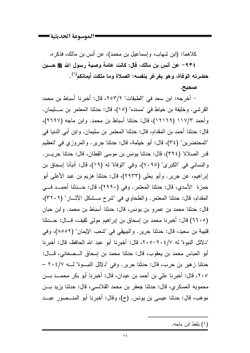 ٩٣٤ - عن أنس بن مالك، قال: كانت عامة وصية رسول اللَّه -صلى اللَّه عليه وسلم- حين حضرته الوفاة، وهو يغرغر بنفسه: الصلاة وما ملكت أيمانكم (¬١).
