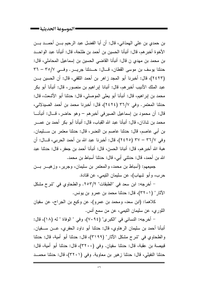 بن حمدي بن علي الهمذاني، قال: أن أبا الفضل عبد الرحيم بن أحمد بن الأخوة أخبرهم، قال: أنبأنا الحسين بن أحمد بن طلحة، قال: أنبأنا عبد الواحد بن محمد بن مهدي، قال: أنبأنا القاضي الحسين بن إسماعيل المحاملي، قال: حدثنا يوسف بن موسى القطان، قال: حدثنا جرير. وفي ٧/ ٣٥ - ٣٦ (٢٤٢٣)، قال: أخبرنا أبو المجد زاهر بن أحمد الثقفي، قال: أن الحسين بن عبد الملك الأديب أخبرهم، قال: أنبأنا إبراهيم بن منصور، قال: أنبأنا أبو بكر محمد بن إبراهيم، قال: أنبأنا أبو يعلى الموصلي، قال: حدثنا أبو الأشعث، قال: حدثنا المعتمر. وفي ٧/ ٣٦ (٢٤٢٤)، قال: أخبرنا محمد بن أحمد الصيدلاني، قال: أن محمود بن إسماعيل الصيرفي أخبرهم - وهو حاضر، قال: أنبأنا محمد بن شاذان، قال: أنبأنا عبد اللَّه القباب، قال: أنبأنا أبو بكر أحمد بن عمر بن أبي عاصم، قال: حدثنا عاصم بن النضر، قال: حدثنا معتمر بن سليمان. وفي ٧/ ٣٦ - ٣٧ (٢٤٢٥)، قال: أخبرنا عبد اللَّه بن أحمد الحربي، قال: أن هبة اللَّه أخبرهم، قال: أنبأنا الحسن، قال: أنبأنا أحمد بن جعفر، قال: حدثنا عبد اللَّه بن أحمد، قال: حدثني أبي، قال: حدثنا أسباط بن محمد.